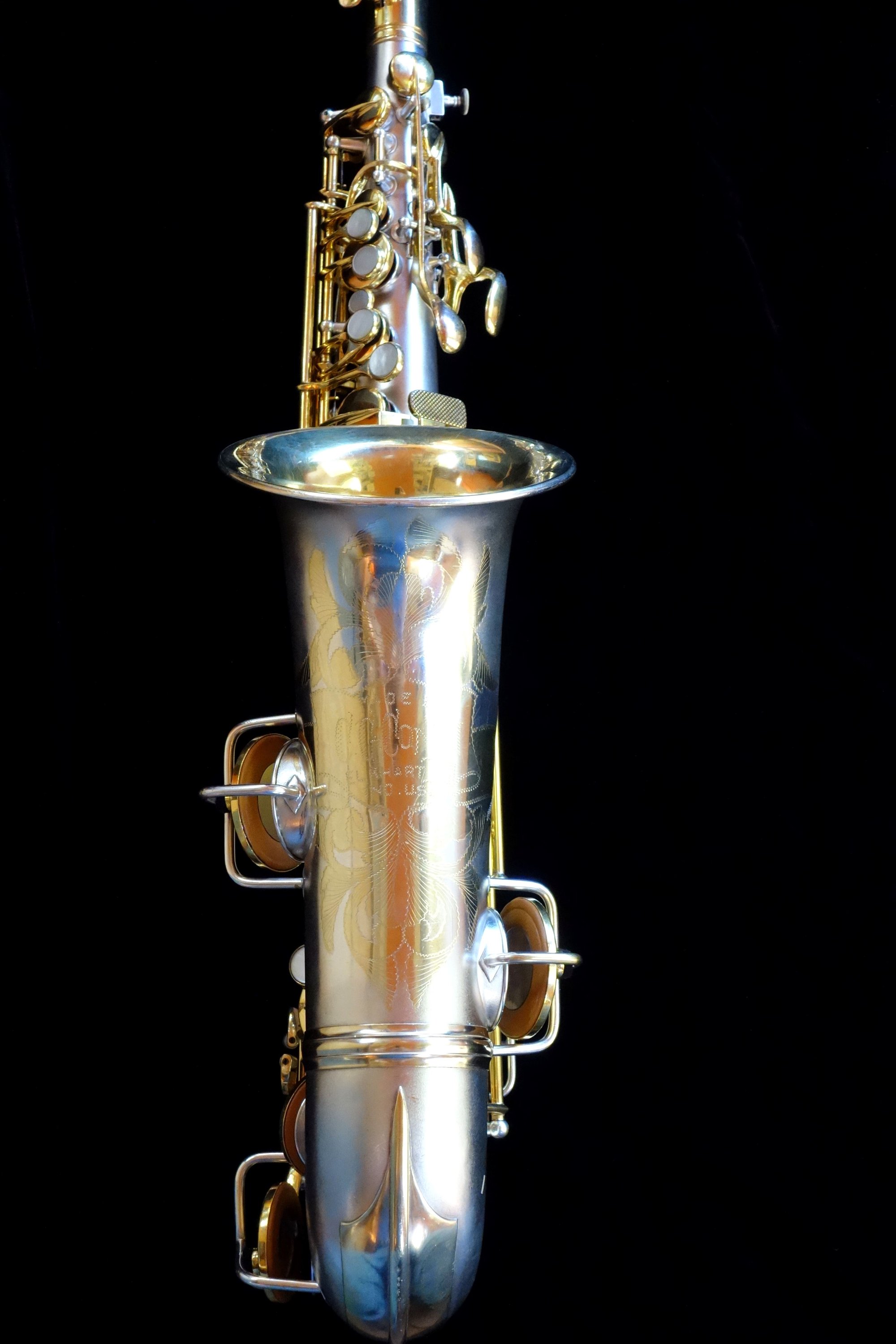 The alto is a premium finish of the time, gold plated keys and engraving with a silver plated body. Typically the gold on horns with this finish seem to be very worn out or even worse evenly thinned out, leaving the gold color unsaturated and weak- perhaps due to repairers in the past throwing the keys in with the body in to a silver cleaning solution, which will strip gold down in short order. These keys however have enough of their gold left to show what these horns originally looked like, and the result is beautiful.