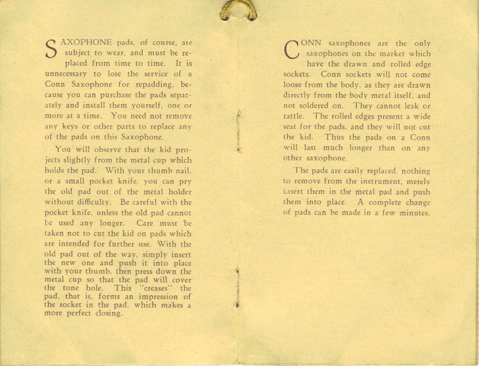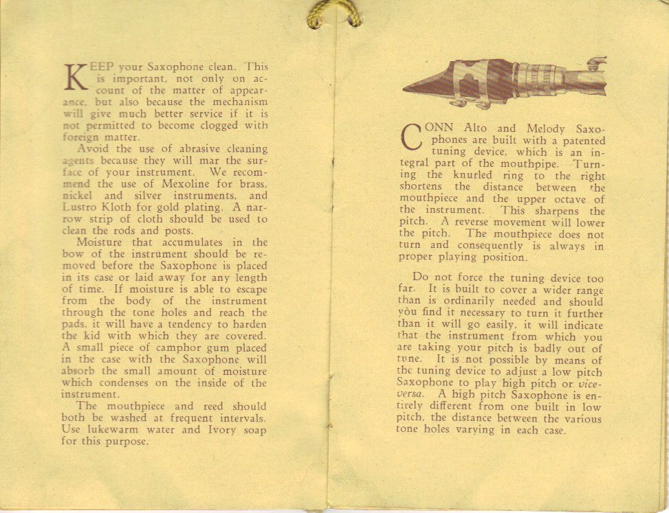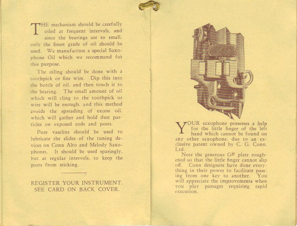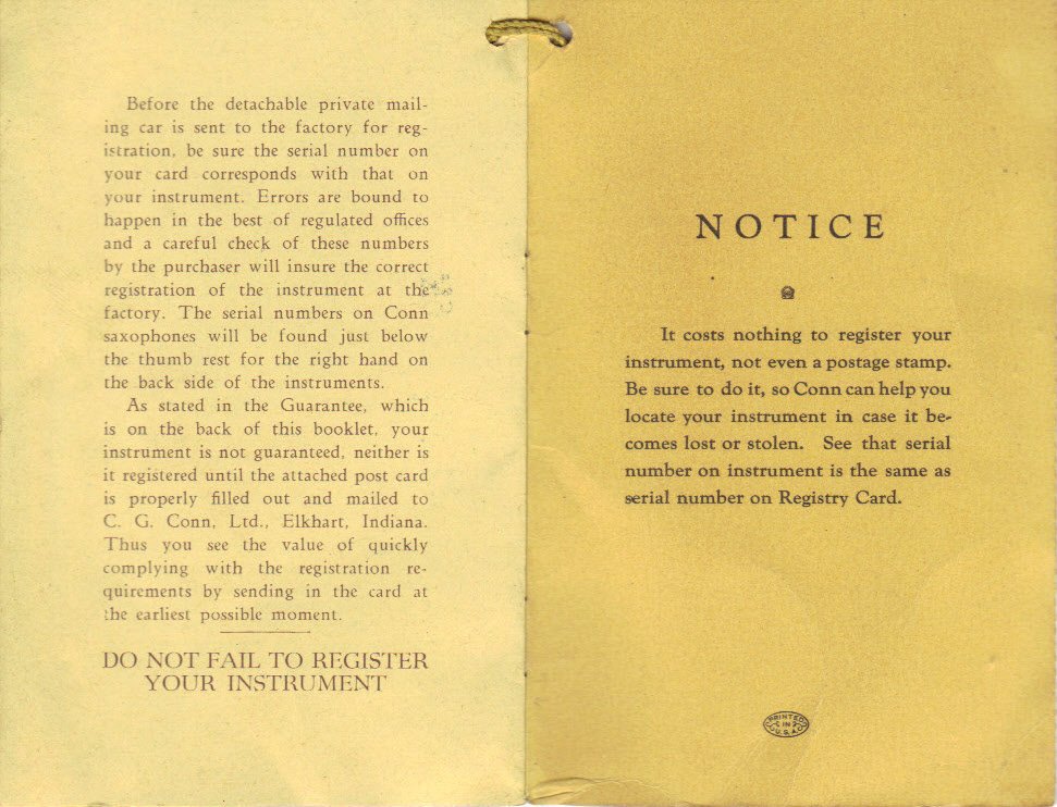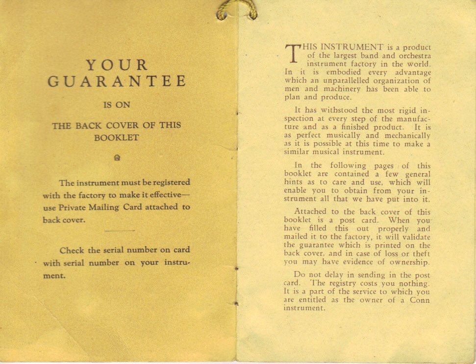 A complete Conn warranty booklet from 1931 from a early New Wonder II style transitional alto with art-deco engraving and raised side E key. All photos will enlarge when clicked.