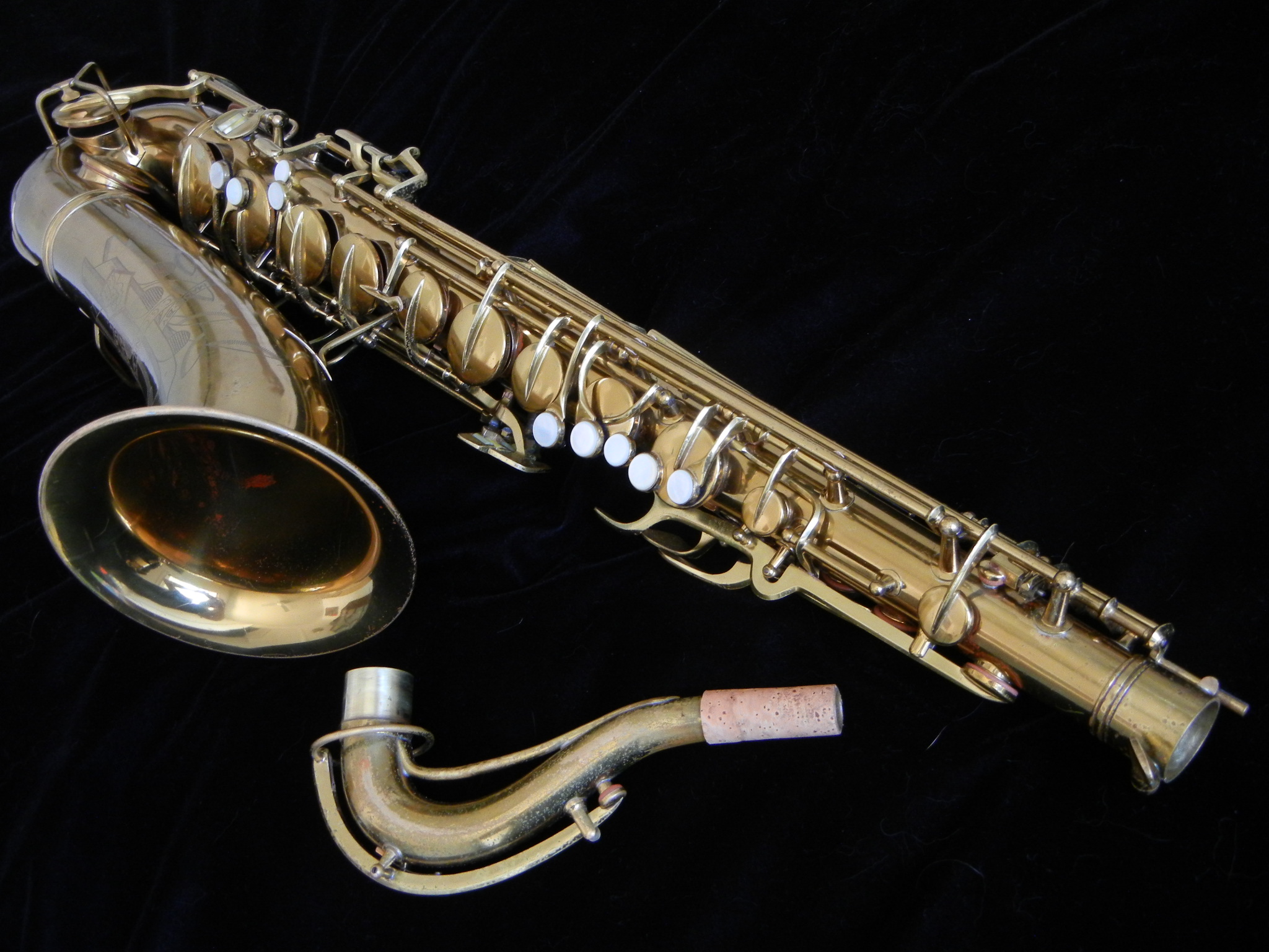 This is a beautiful pre-war Conn 10M tenor saxophone with rolled tone holes and original lacquer in very good condition. It has just been completely overhauled with flat metal resonators, and it is tight, light and slick under the fingers and plays with a monumentally huge and effortless tone. Intonation is excellent, and it is very mouthpiece-friendly.