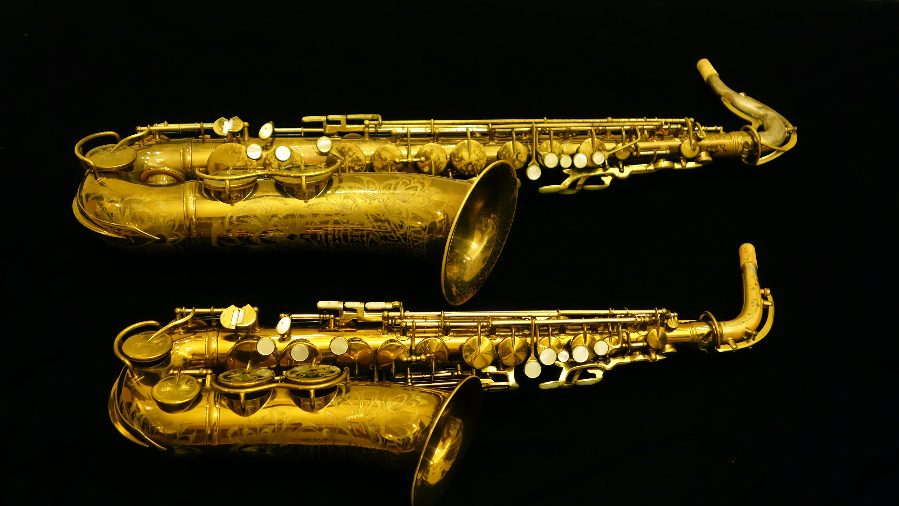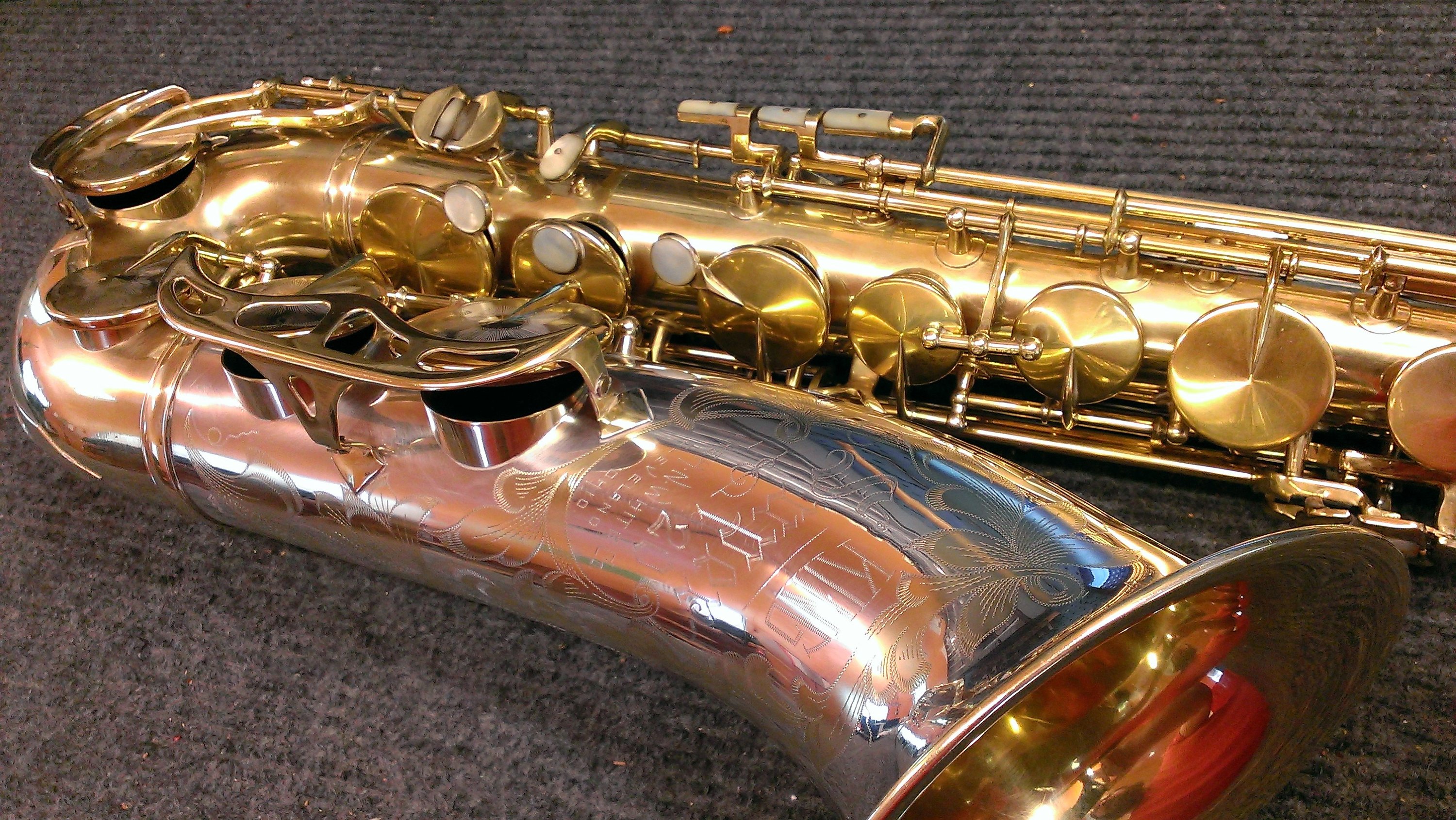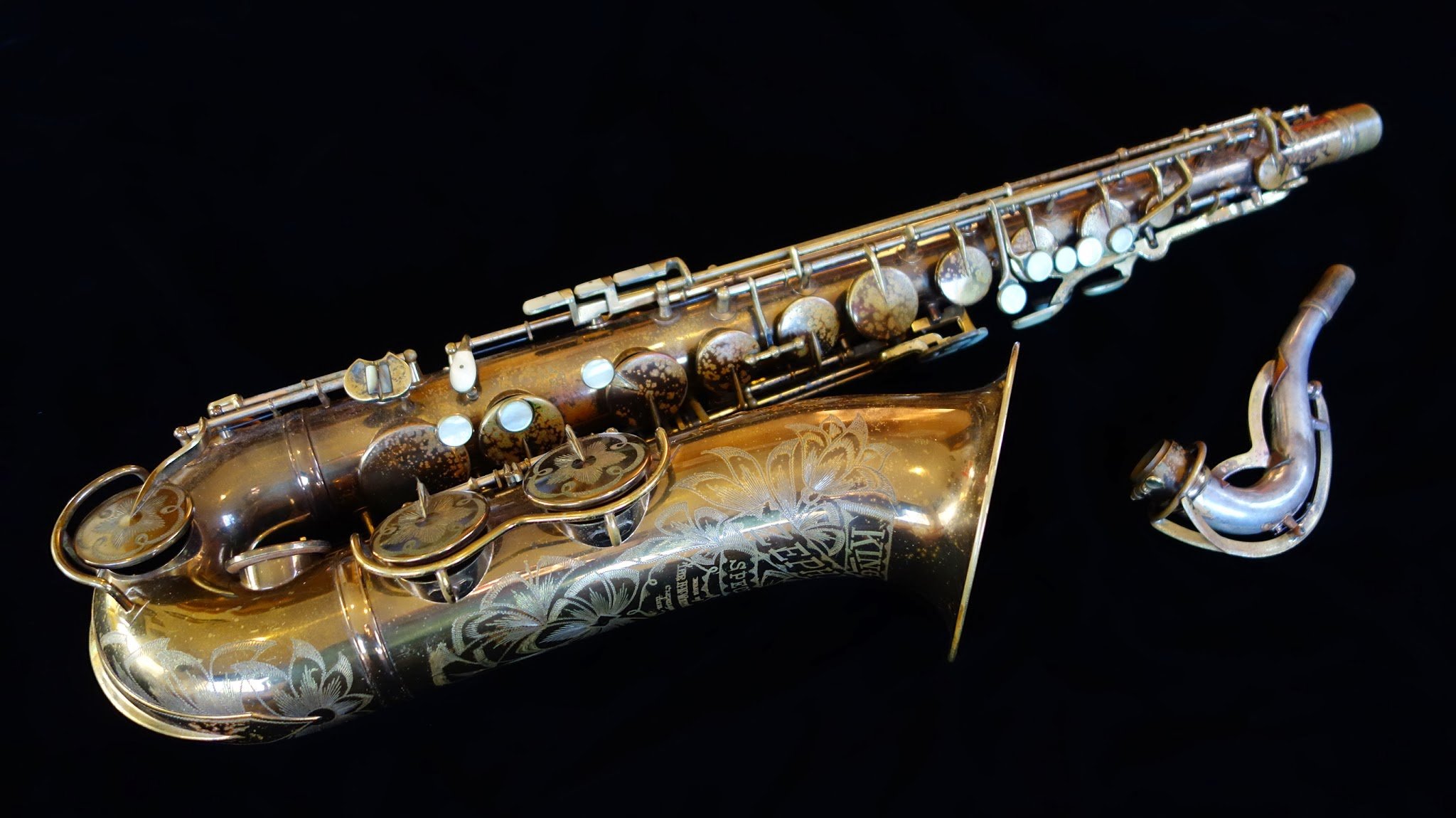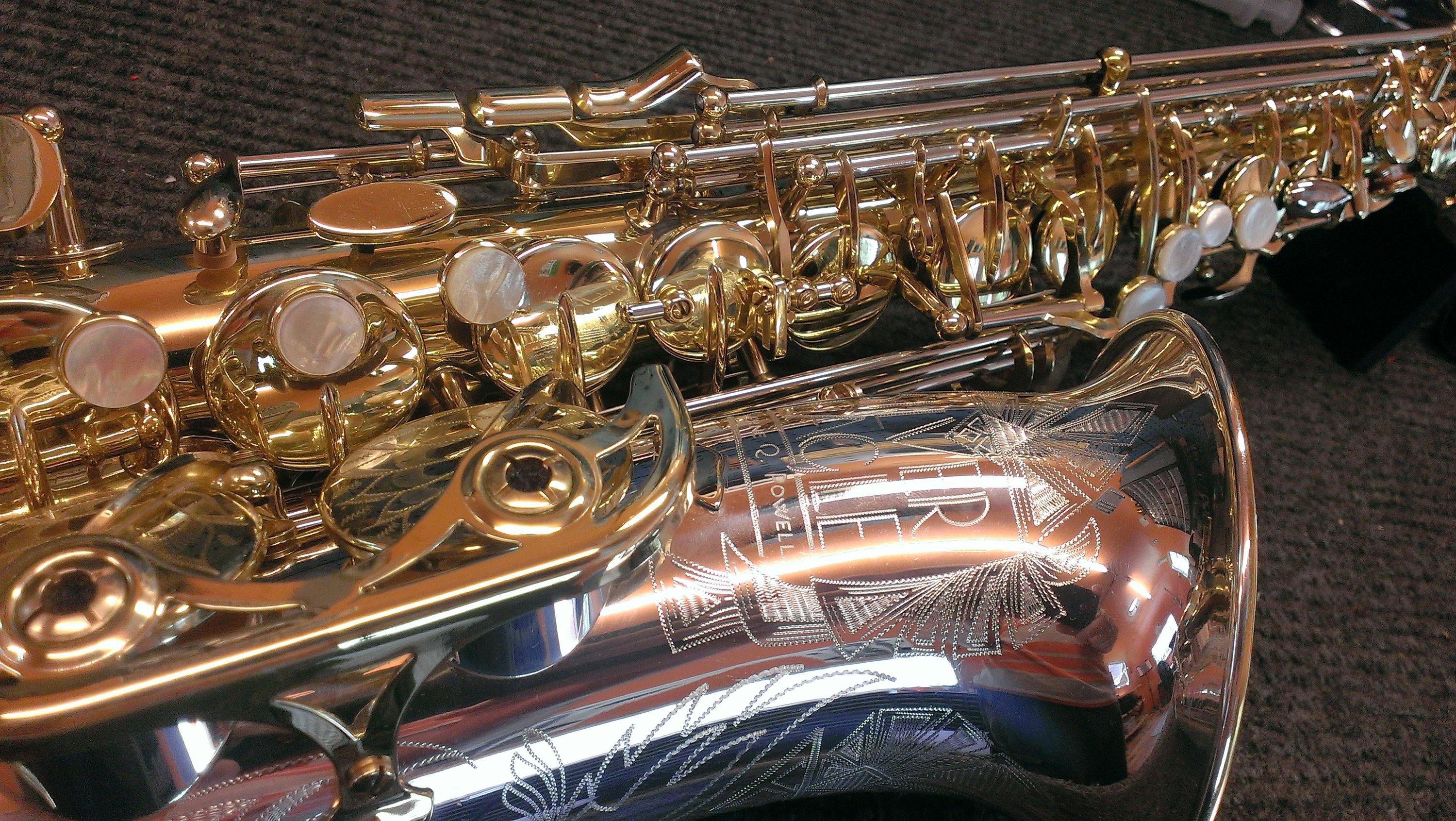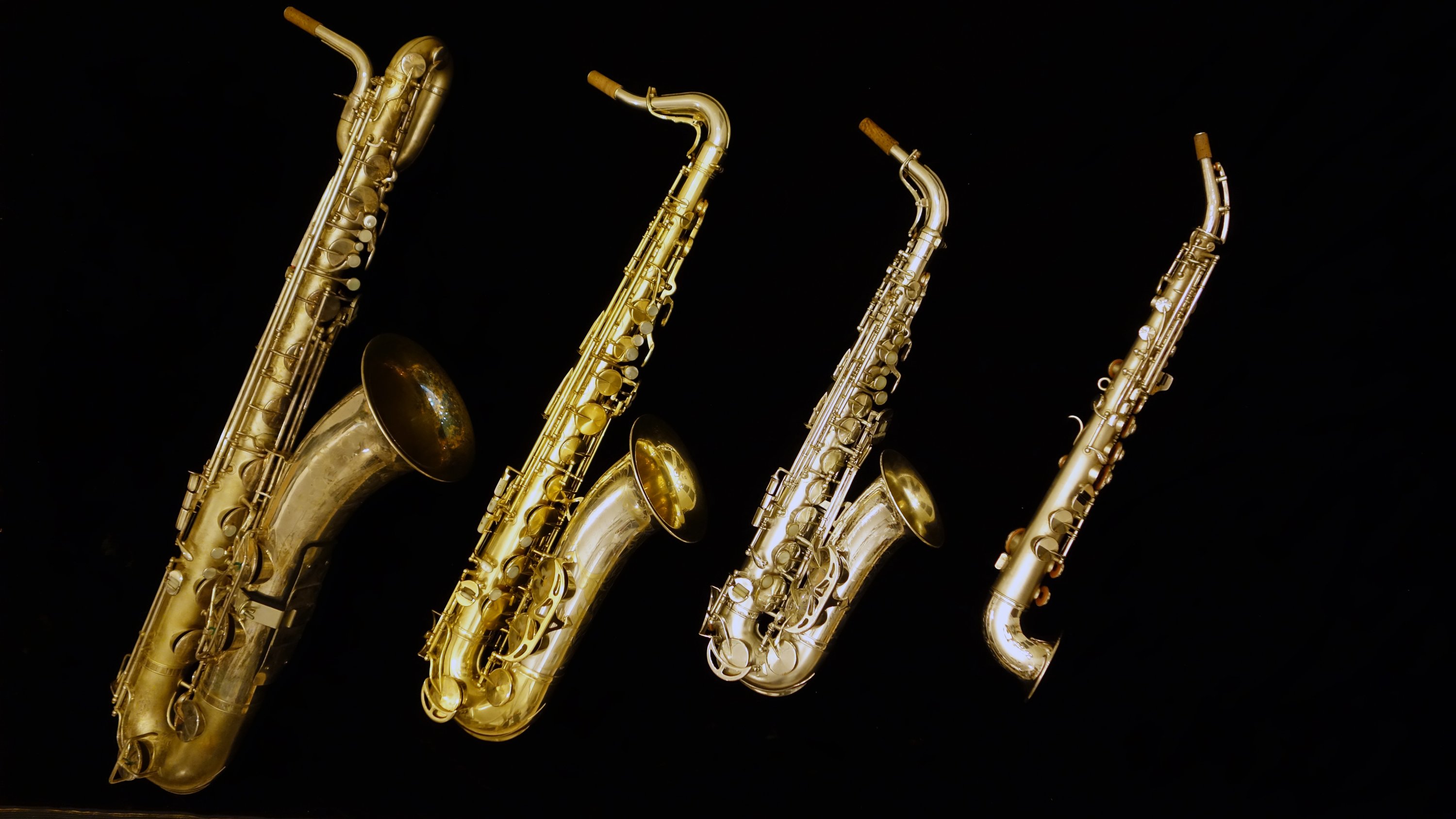 I am lucky enough to live down the street from Brian from GetASax.com, and every once in a while we find that between the two of us we are in temporary possession of an unusually full grouping of a particular type of saxophone. Last time, it was a Conn night. This time, it was Kings. Between the two of us (mostly him, but I did have the tenor Zephyr Special which he didn’t have one of) we had enough Zephyr Specials and Super 20s and even a Saxello to cover the soprano part, and even a Powell Silver Eagle, which is based on the Super 20 to take some rather amazing photos, if you are into this sort of thing. Enjoy!