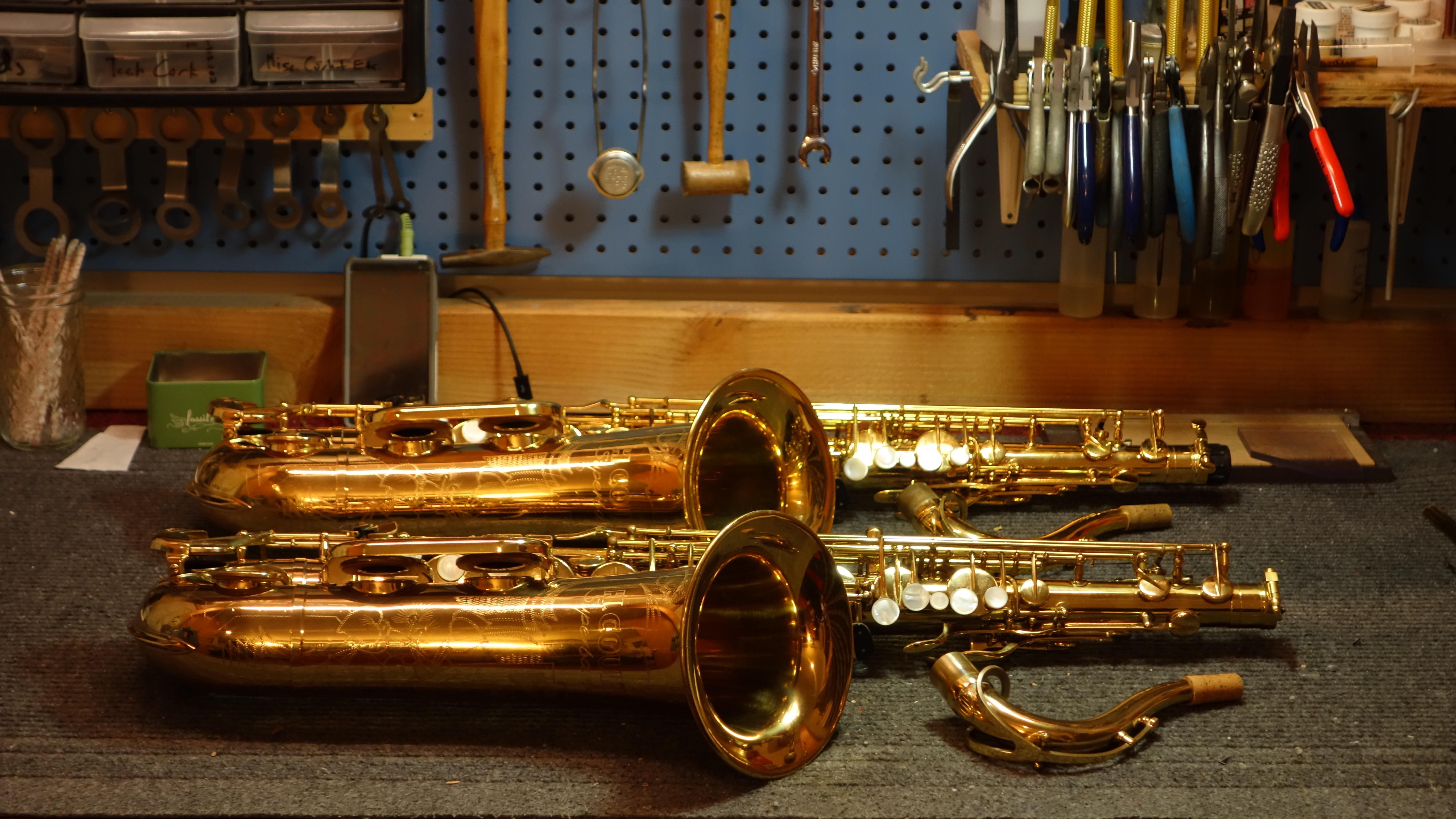 Pictured above are two Couf Superba I tenor saxophones. They are within 2000 serials of each other, are both in very good original condition with fully intact original finishes, and have both been overhauled by me at the request of their owners to have exactly the same setup- same pads, same resonators, exact same key heights, overhauled by the same repairman- and unlike most new horns, they are demonstrably leak-free.