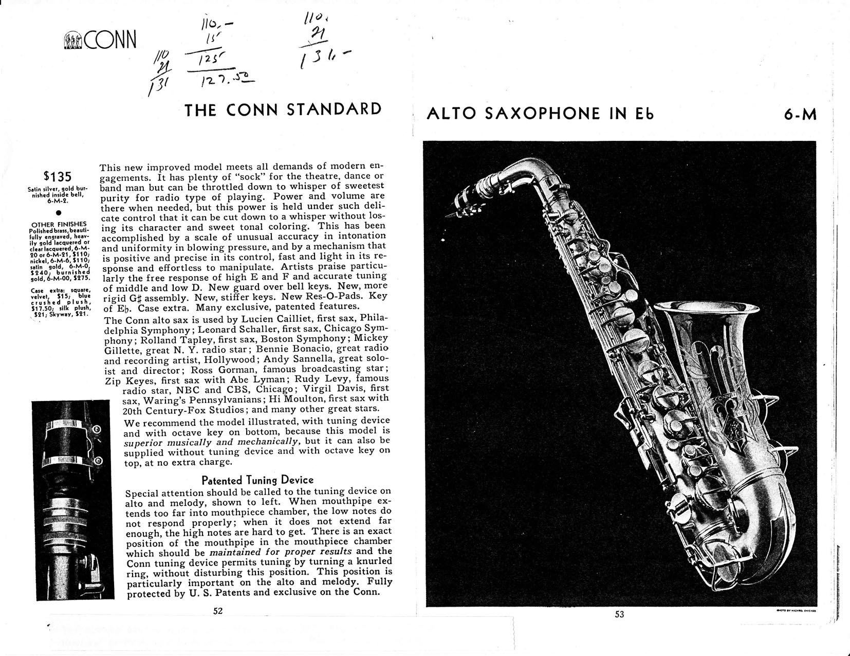 (Note: The name “6M” comes from Conn’s model number for altos at the time, and the 6M model number is seen in catalogs only until 1936, when Conn started stamping 6M on the body of the saxophone above the serial number.)