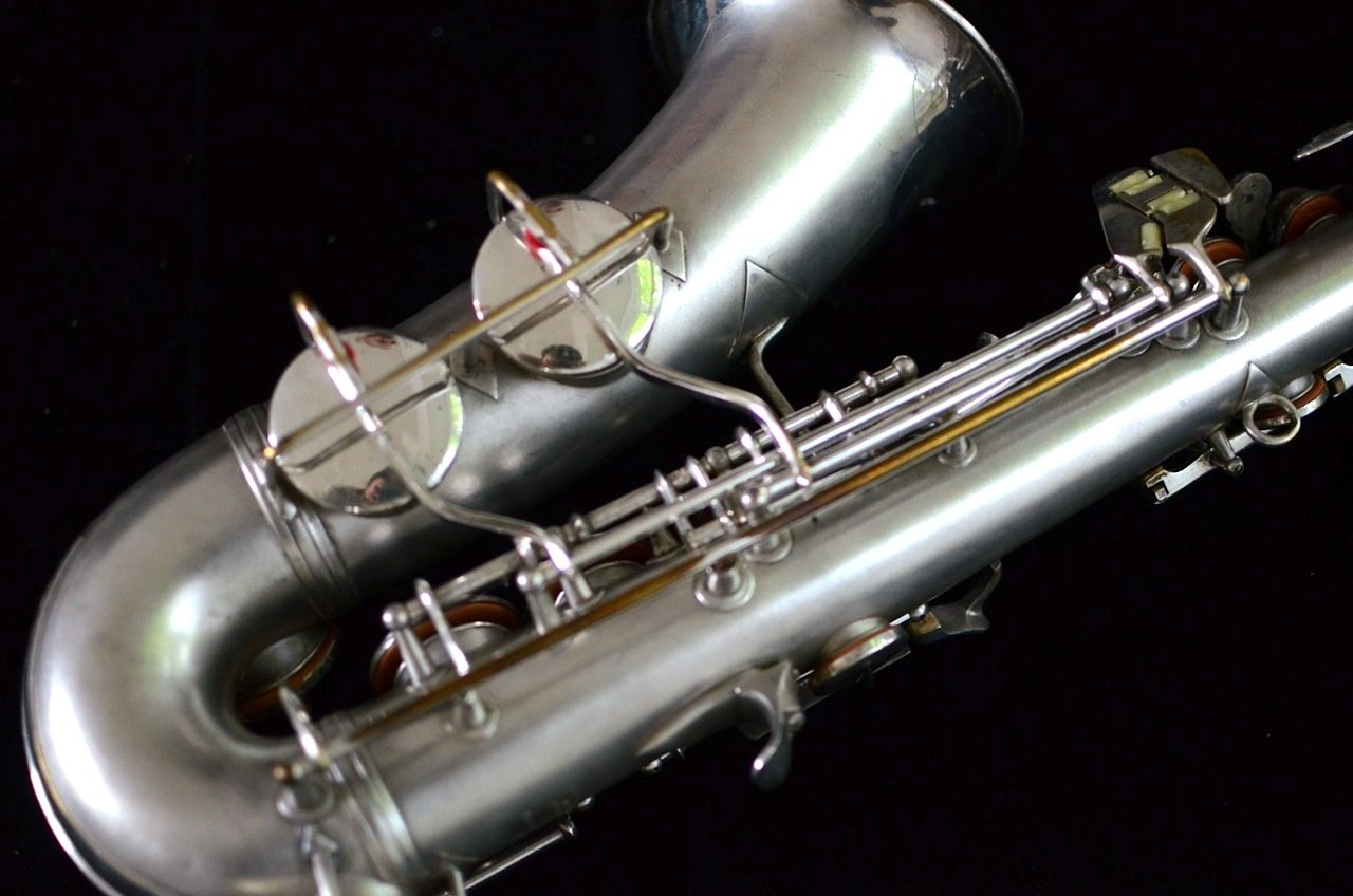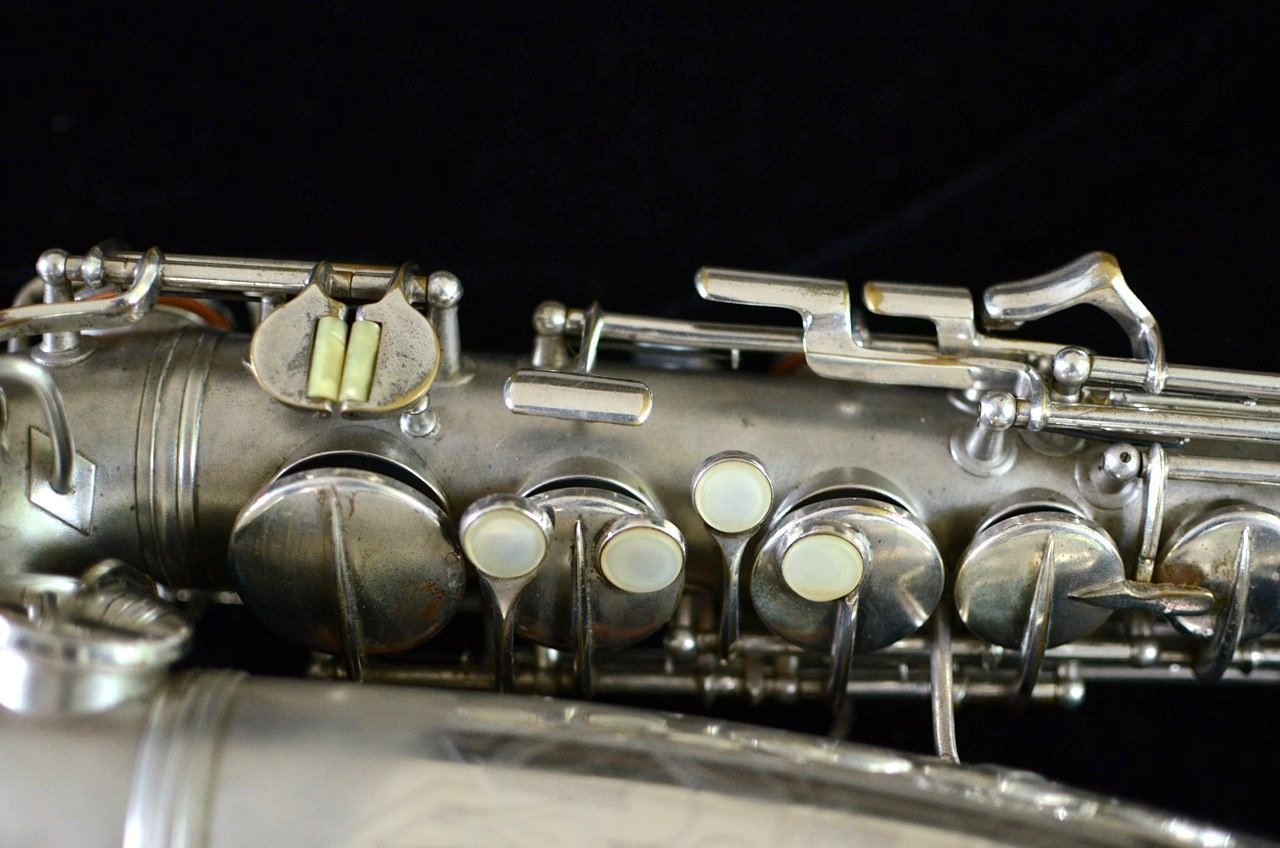 To some, the “true” transitionals are only the saxophones with left-hand bell keys. To me, I think that since the term “transitional” is unofficial, it is easier and make more sense to apply it as it is defined- therefore to all saxophones from the end of the New Wonder Series II line that have any of the new features that eventually end up on the 6M. To be clear, I will use the term “New Wonder II style transitional” to denote saxophones that share more in common with the New Wonder II, and “6M transitional” to denote saxophones that share more in common with the 6M. The changeover occurs from New Wonder II style transitional to 6M transitional with the switching of the bell keys from a split bell key design (New Wonder II style) to left-hand bell keys (6M style), which happens around serial number 245,xxx in 1931.