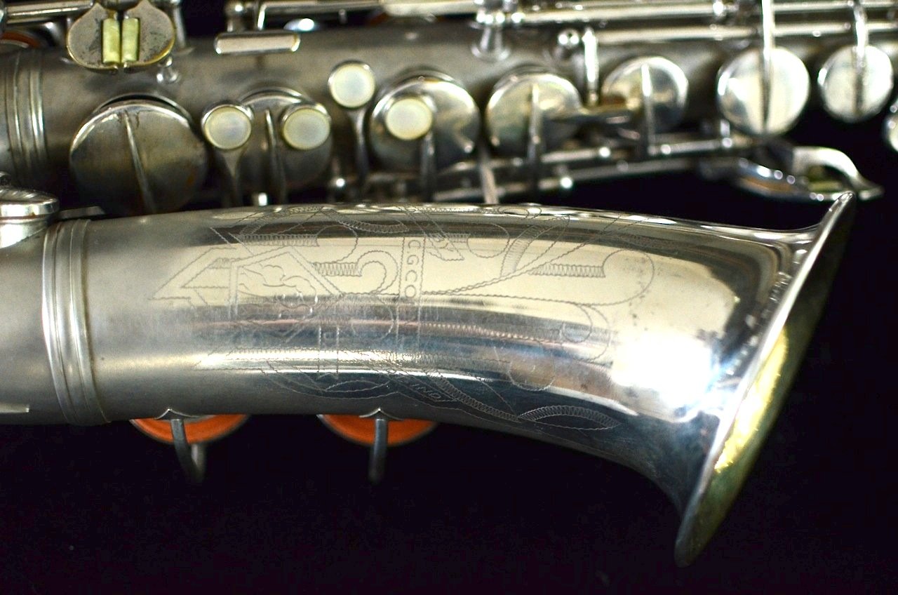 -the optional non-tuner (and the very rare tunable) overslung alto necks -the 26M Connqueror series beginning in 1935 (also offered with an optional overslung neck - of yet another design) -the nickname “New York Neck,” of unknown origin, usually used for the non-tuner overslung, but sometimes confused with the METRO neck -the letter A at the end of most alto serial numbers in this period (and only this period) -around 270k, the engraving gets larger. The pattern stays the same, but it takes up a larger space on the bell.