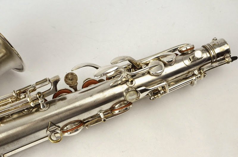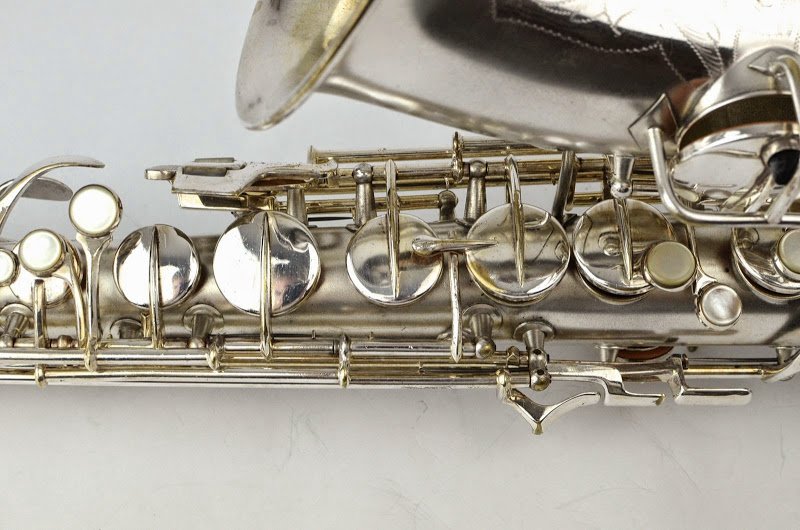 So whatever these X horns are, I have worked on three of them- two tenors and an alto. Both tenors were much like a New Wonder Series II transitional- that is, they were mostly New Wonder Series II but with the raised side E and improved palm key spatulas and no forked Eb. Bizarrely, one of them sported straight toneholes. Interestingly, the alto I have seen (206,xxxAX serial number, pictured below) has almost every feature to be found on the eventual 6M.