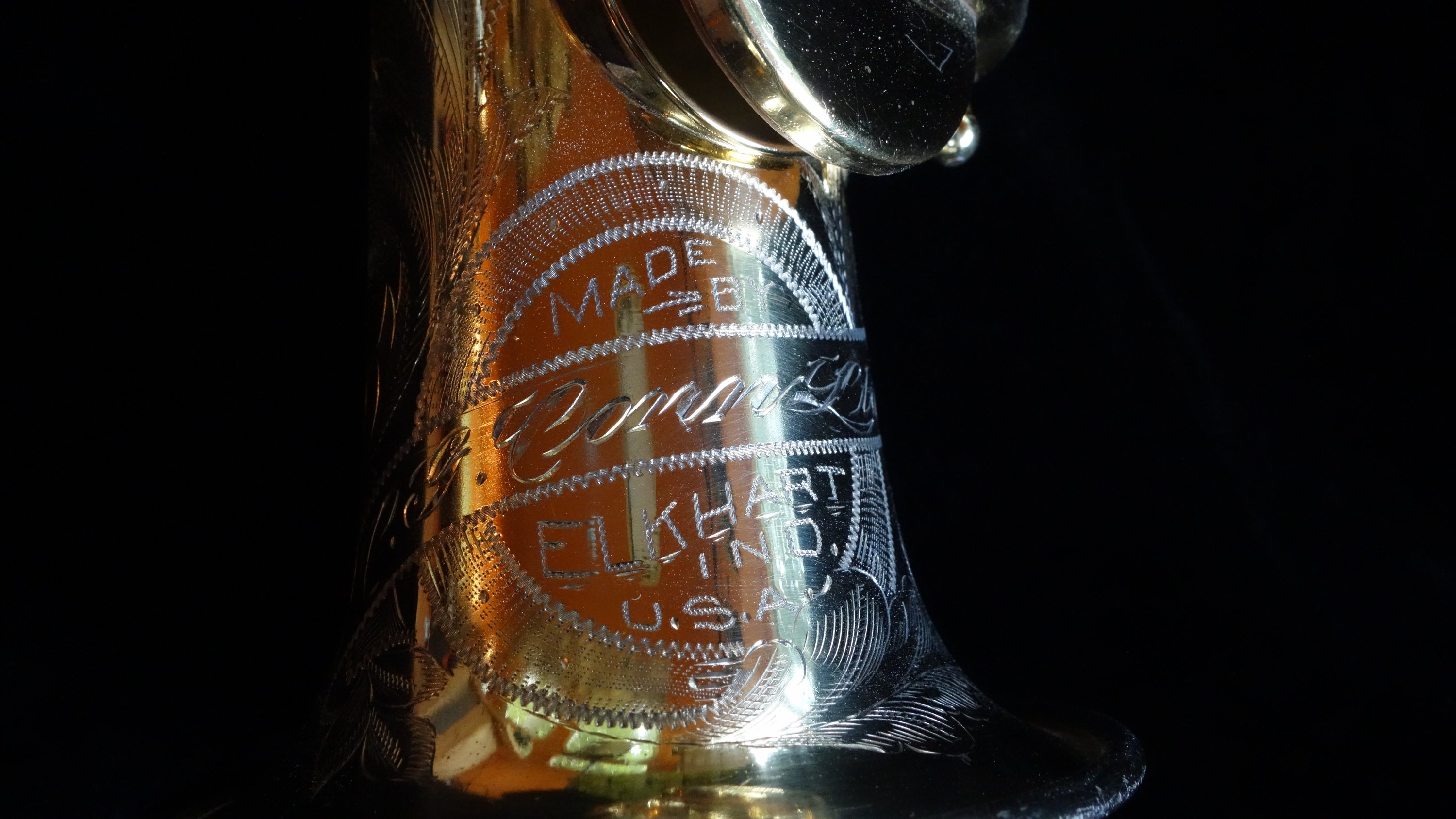 The engraving is quite beautiful and involved, utilizing a lot of straight cuts rather than wiggle cuts, a technique that requires a bit more skill and most likely means that this would have been one of the horns engraved by the top engravers at Conn at the time, the famous Stenberg brothers, more of whose engraving can be seen here and here, along with a little bit of history.