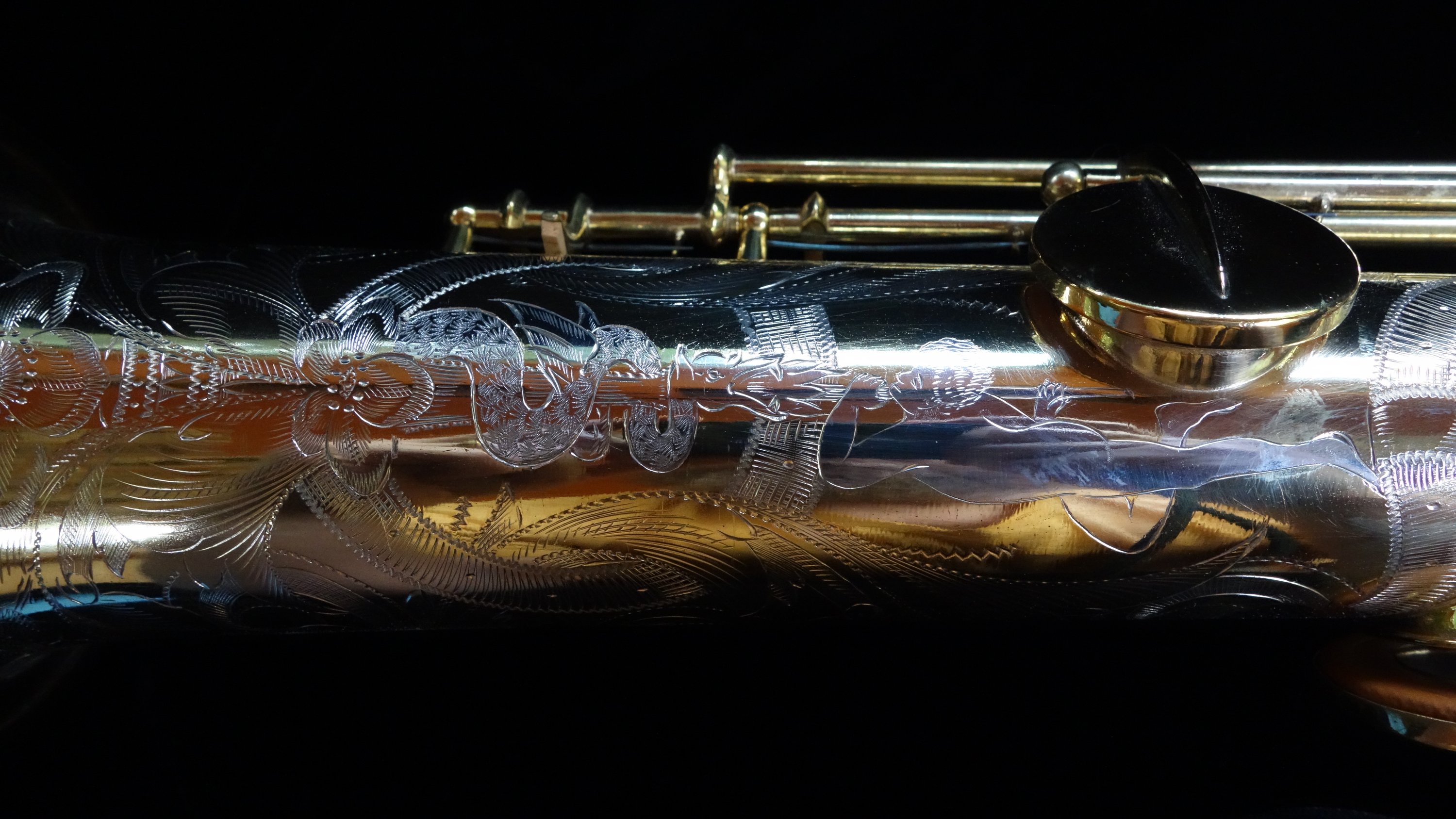 This is a 1926 Conn New Wonder Series II soprano saxophone in the extremely rare finish option known as “Virtuoso Deluxe”. Heavily gold plated and hand burnished, hand-crafted pearl inlay on every key, and elaborate engraving that typically covers the entire horn. On this particular example, there is a dragon-slaying scene (apparently used more than once on Virtuoso Deluxe sopranos of the same era, see here and here) where the dragon and the dragon-slayer are highlighted in silver.