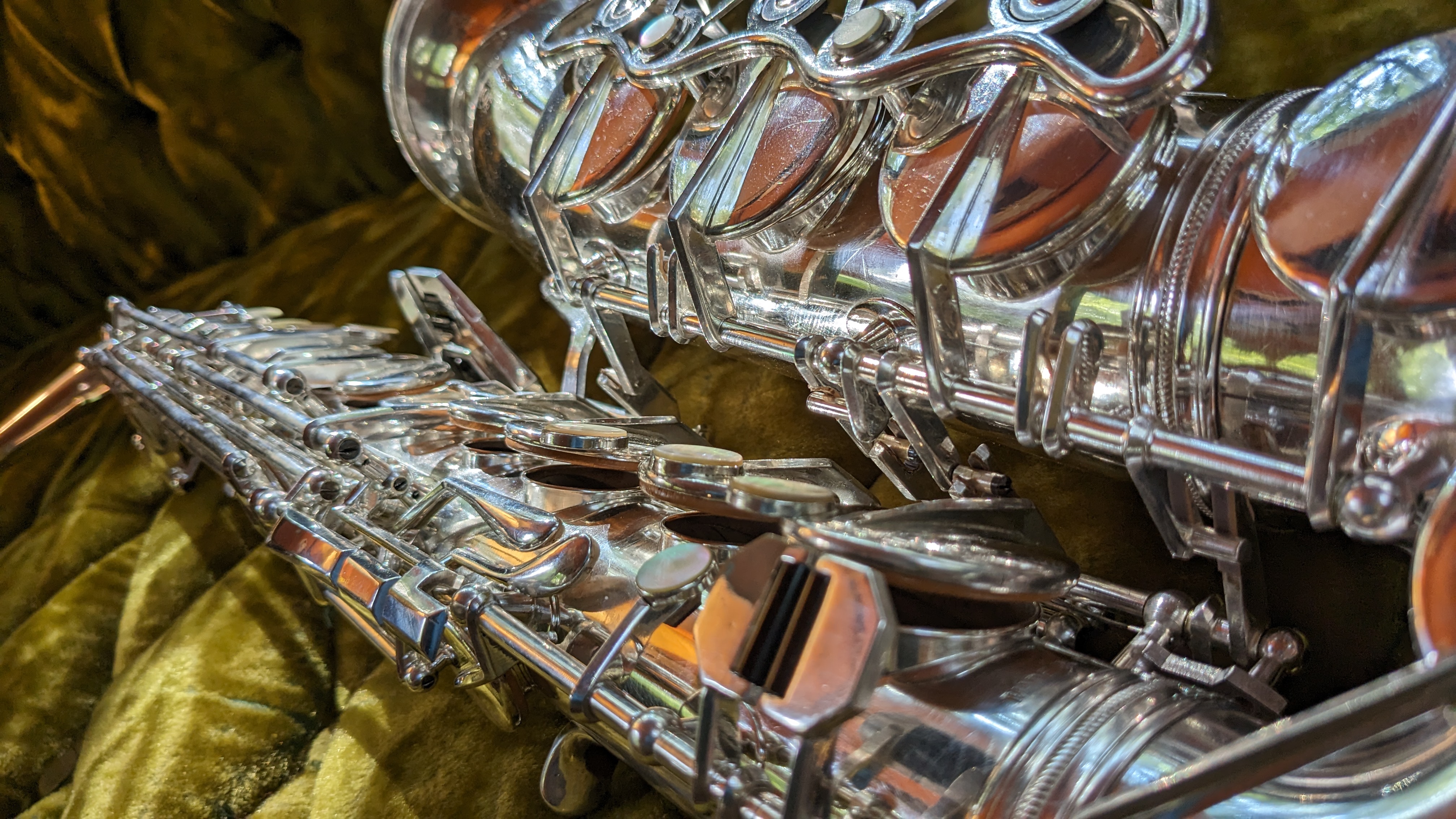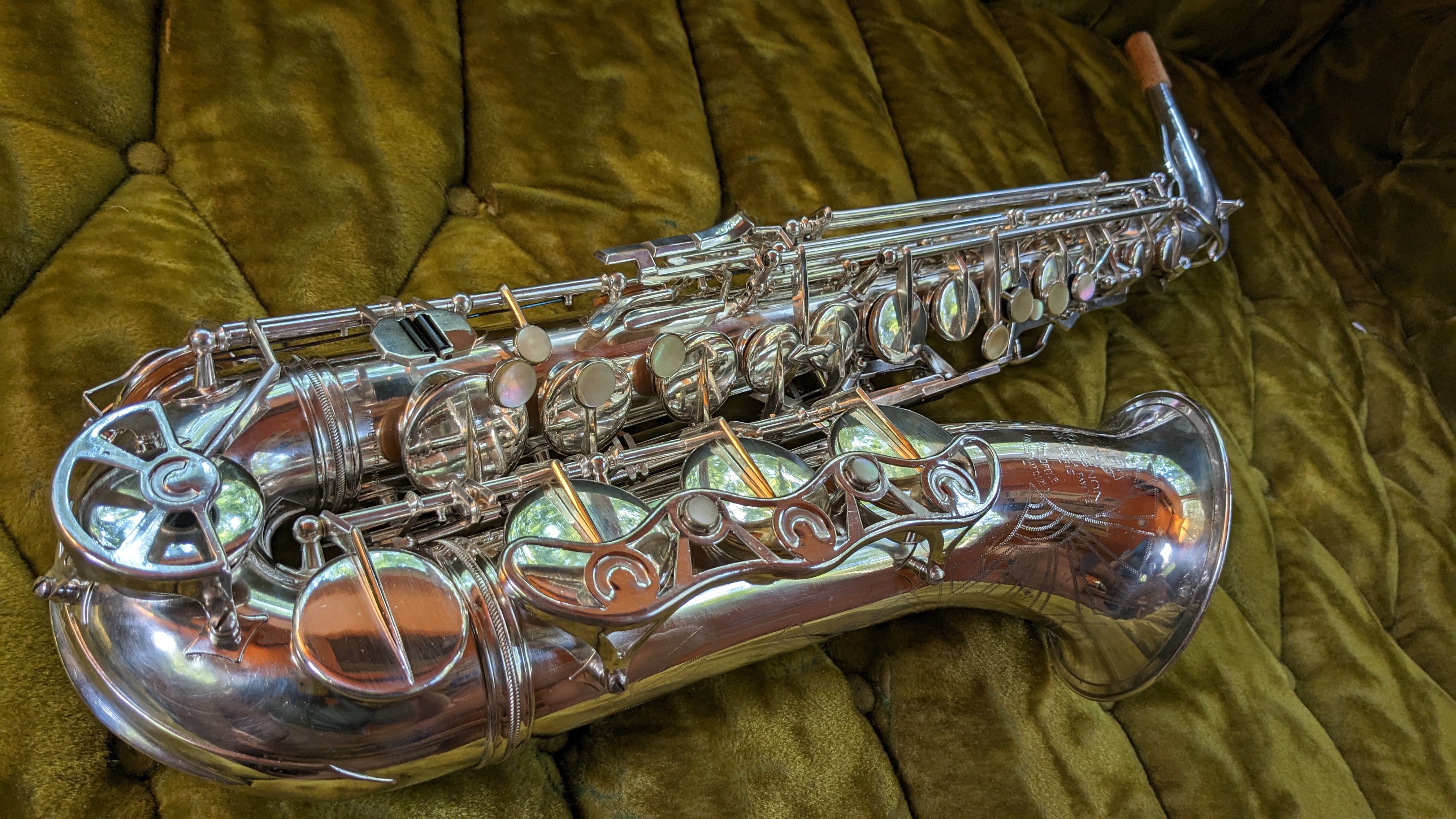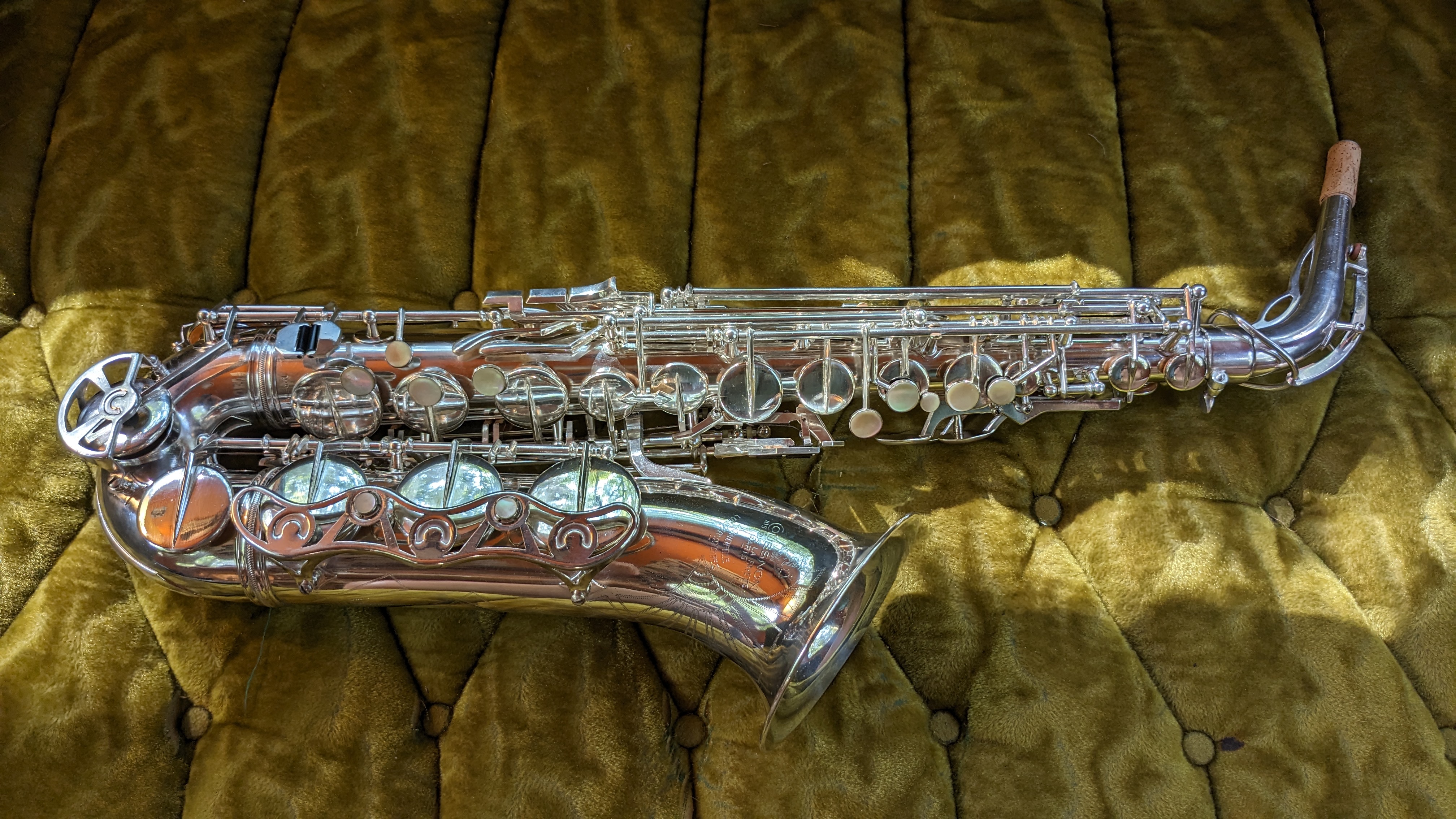 Couesnon Monopole II low A alto, original finish, just overhauled by me. The “other” low A alto, and keyed to high G. Plays fantastic, supremely even and in tune, and low Bb sounds like a regular low Bb (unlike Selmer low As, oftentimes). Low A also works with one key, and not at the expense of adding low A once low Bb is already engaged, which is the typical tradeoff with Selmers.