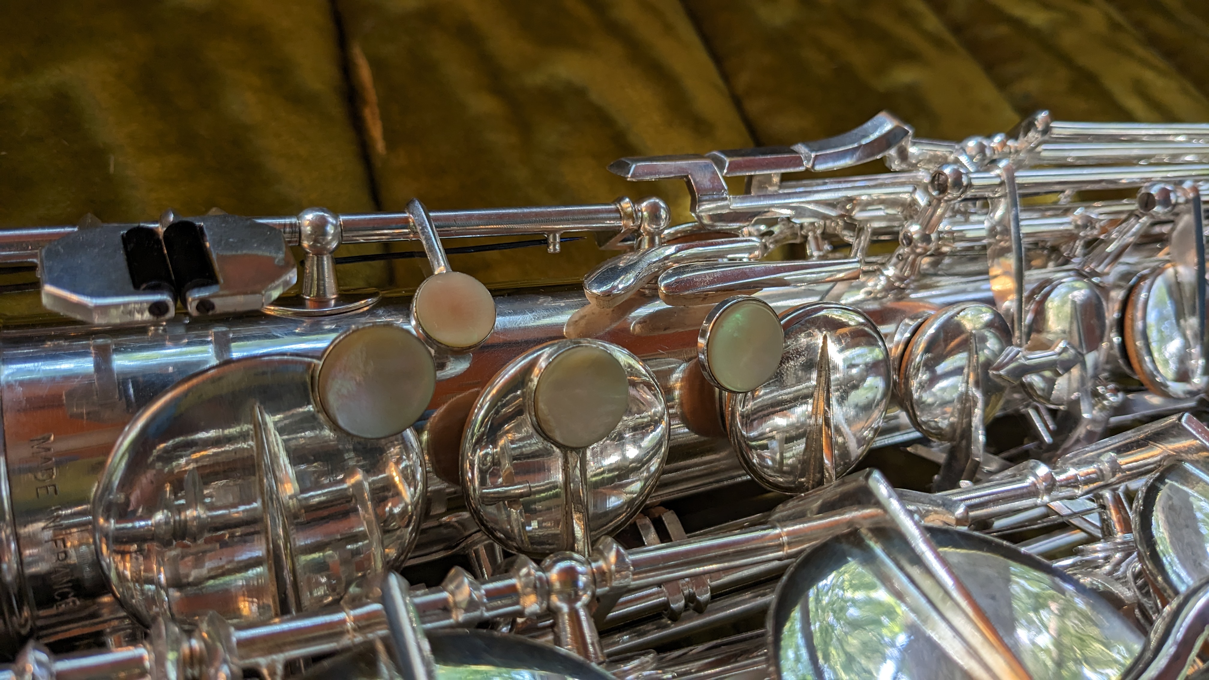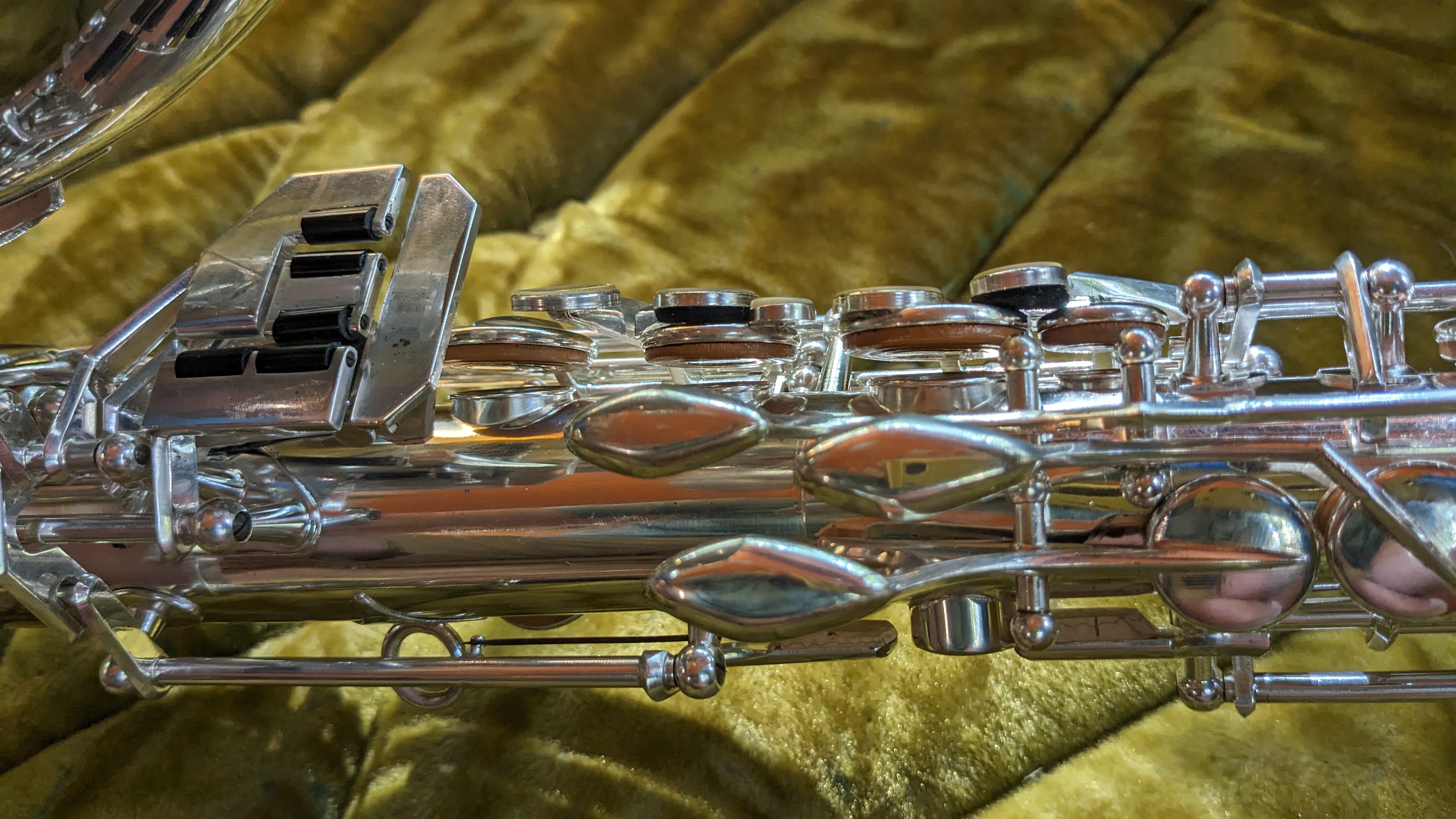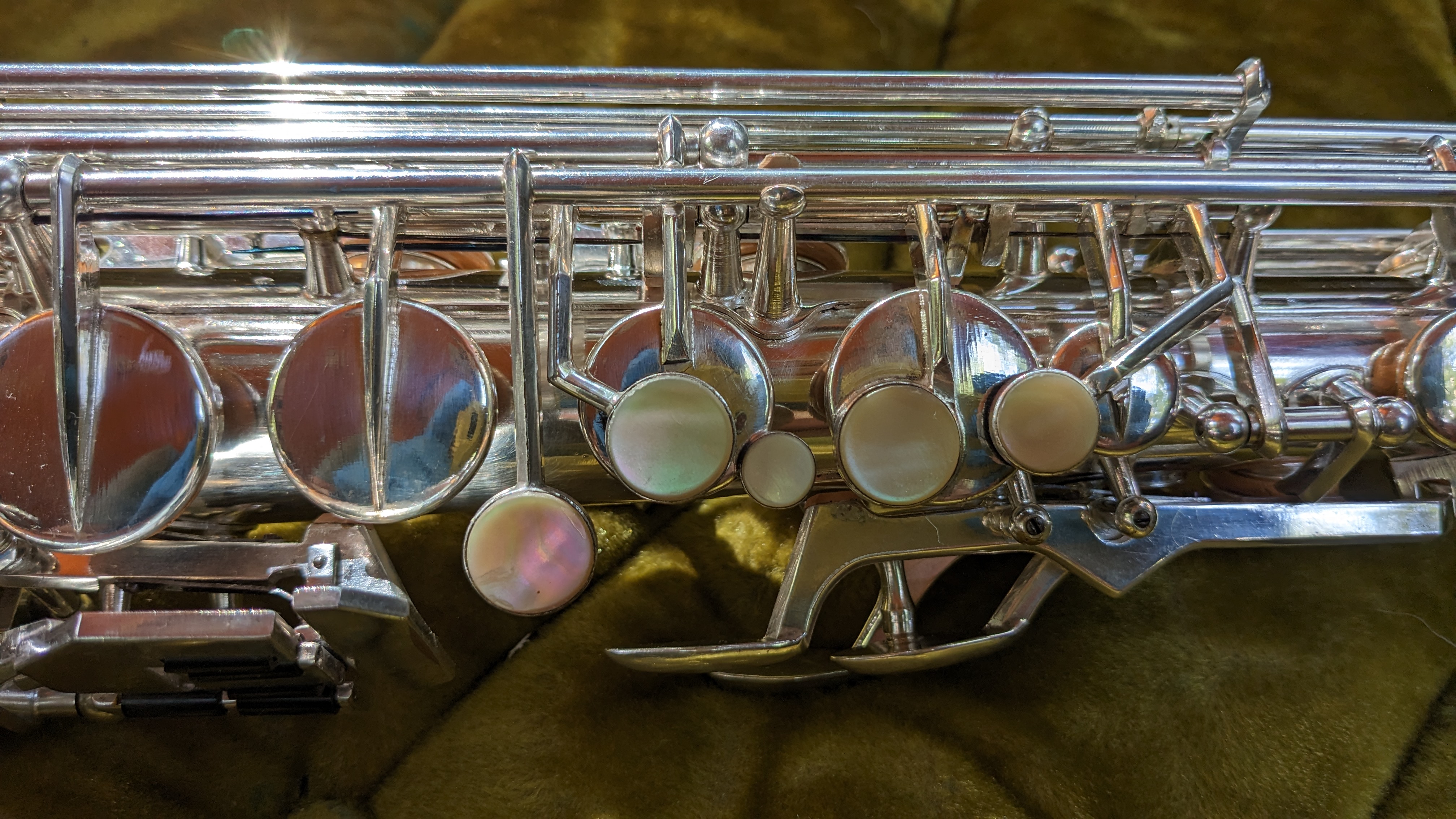 This was a very challenging overhaul. The extra range creates a lot of extra keys, and a lot of extra connections that have to be just right to feel snappy and not spongy or slow. I take pride in my work, but I would say that it is infrequent that I feel straight up proud. This is such an occasion. The keywork feels as snappy- from low A to high G- as a pristine, just overhauled 6M, and the tone is beautiful. Intonation is very good, and the horn is not only unique and rare but also eminently usable. I have become a big fan of Couesnon Monopole I and II horns over the past year or so, and this saxophone, a rare Monopole II variant, was everything I hoped it would be.