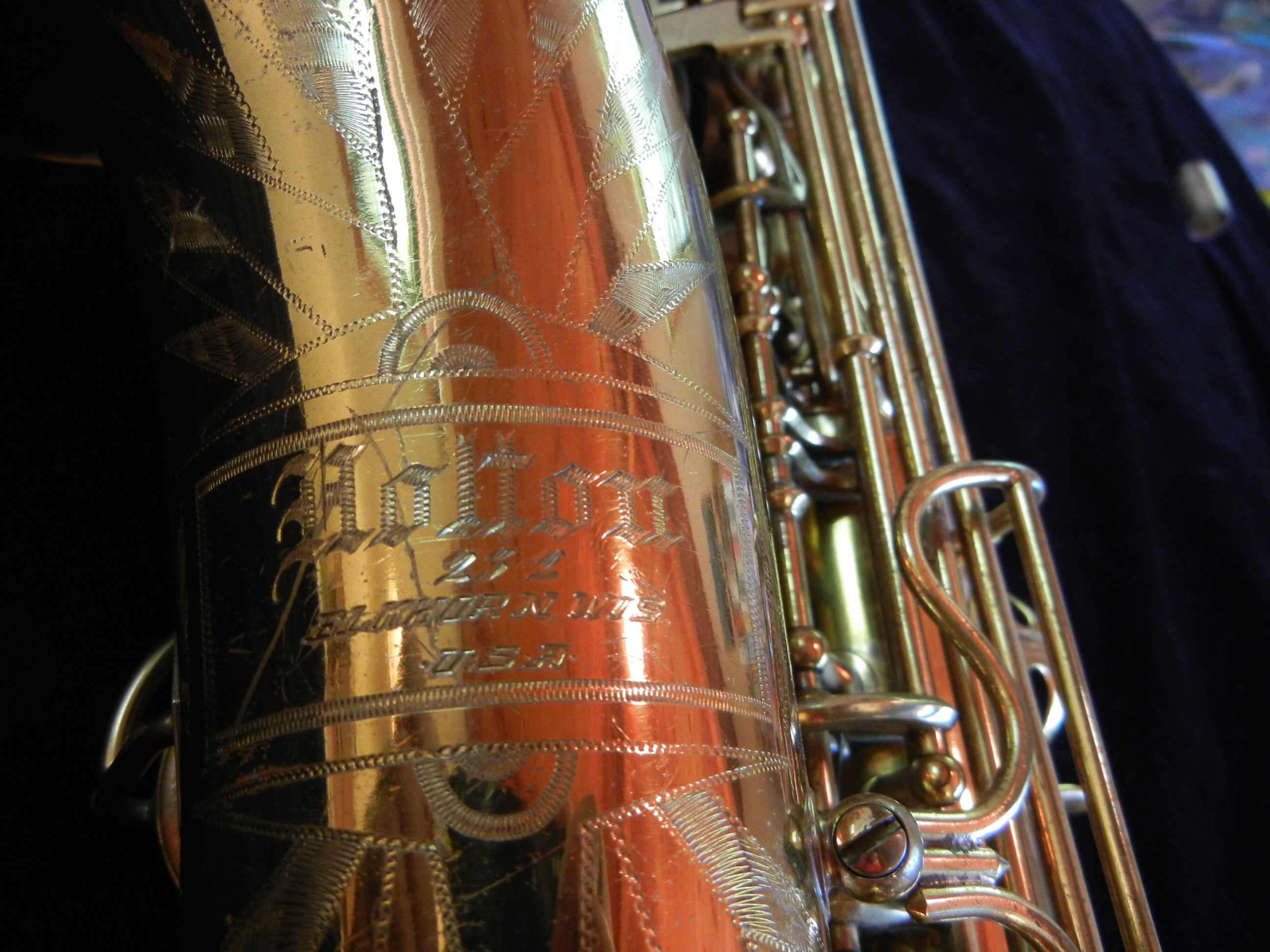 This is a post-war but pre-buyout Holton 232 alto saxophone, a professional model that is identical to the Holton 234 “Stratodyne” (which was their absolute top-of-the-line and the best horn they ever made) with the exception of some aesthetic differences (engraving, key guards) and the design of the octave mechanism. The bore is the same as the Stratodyne, and just like the Stratodyne, under the fingers it is a comfortable horn, intonation is good, build quality is very good, and the tone is great- fat and full and rich.