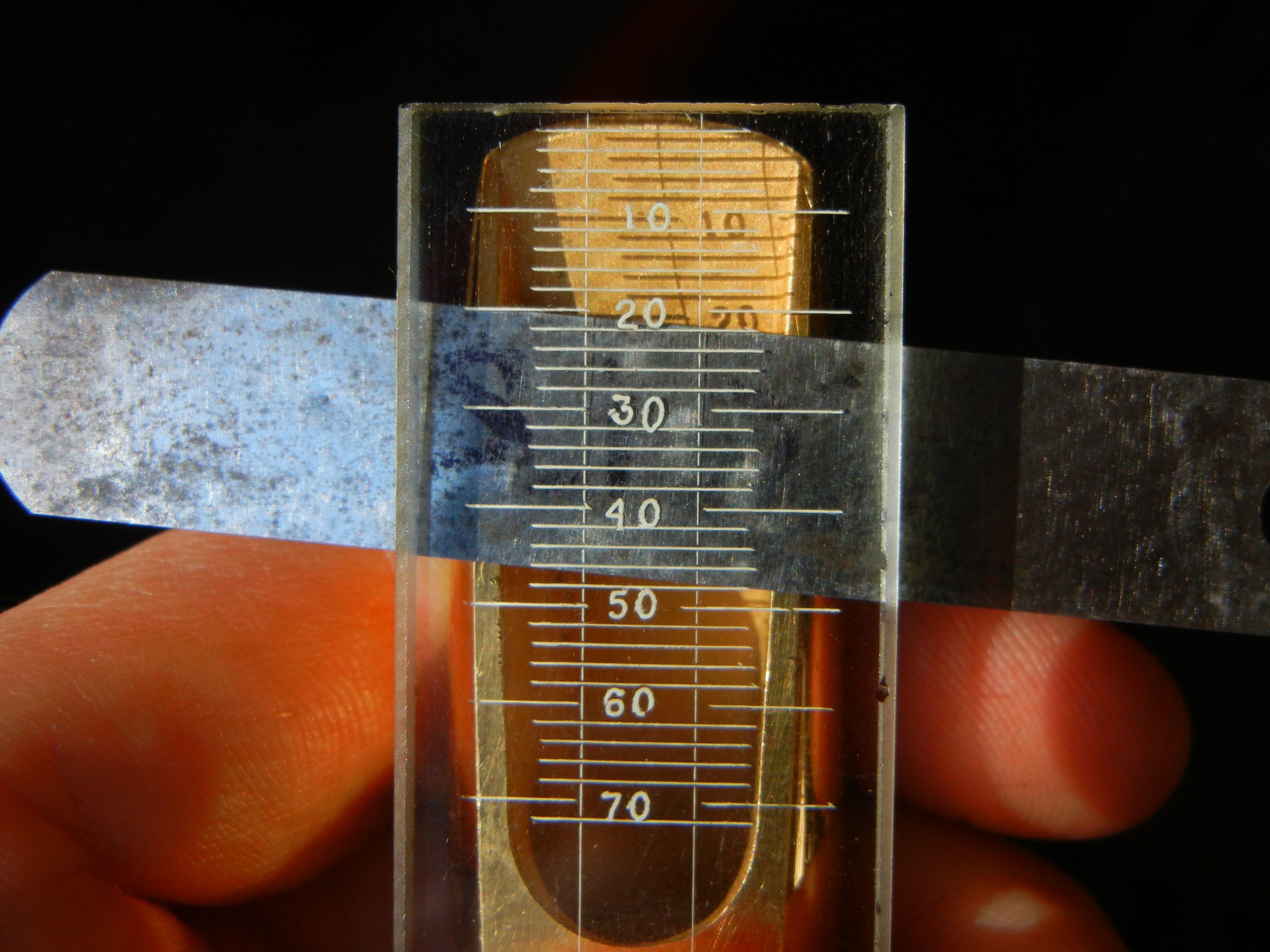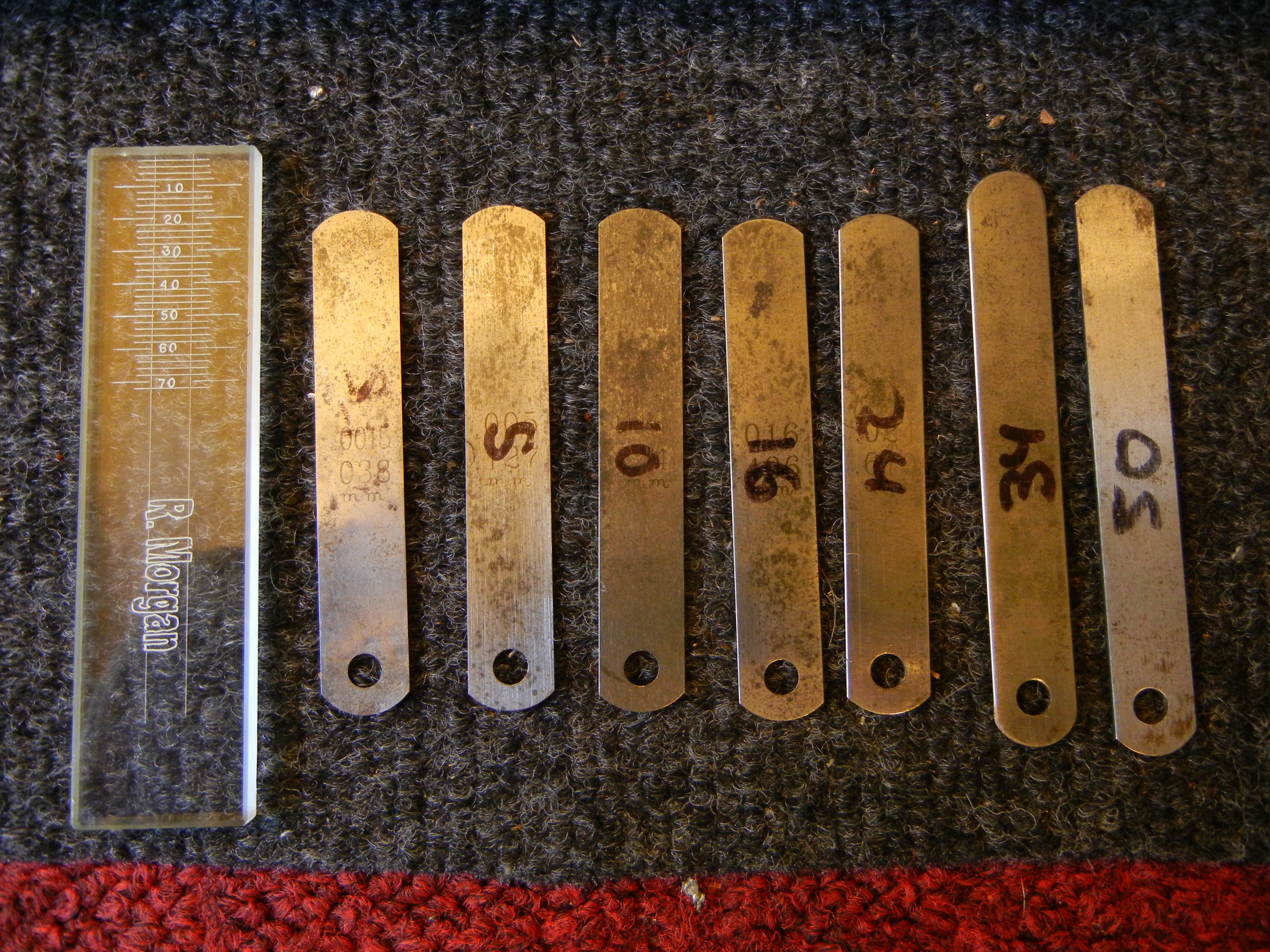 Mouthpiece facings are measured using a flat surface (usually a glass plate) with markings etched in it. This is held flat against the table, and feeler gauges of different thicknesses are slid down the facing until they won’t go any farther. In this way, the distance of the varying thicknesses can be plotted on a curve- the facing curve. More feeler guages = more precision. What particular gauges to use, how many, and what thicknesses are up to the individual doing the facing.
