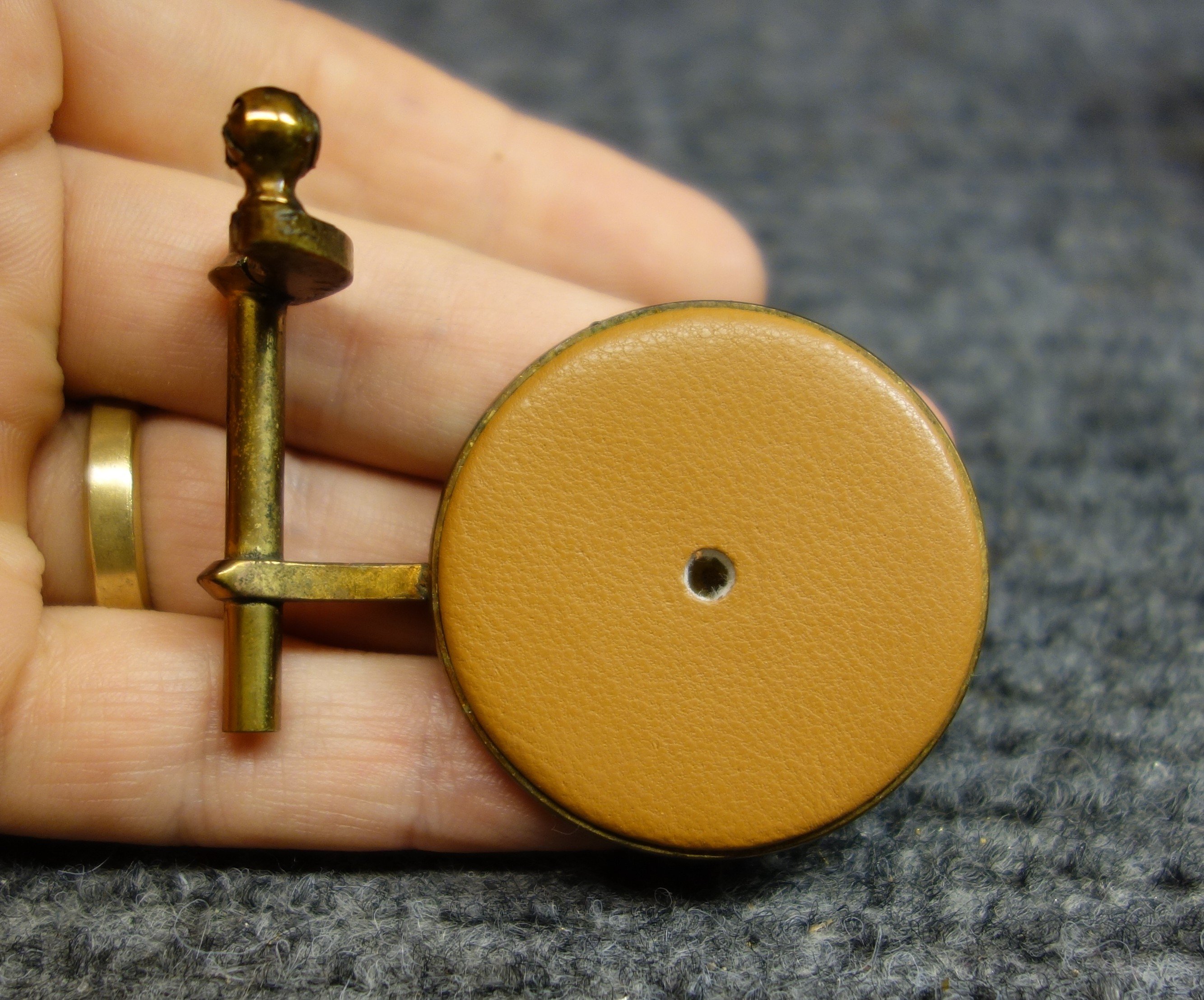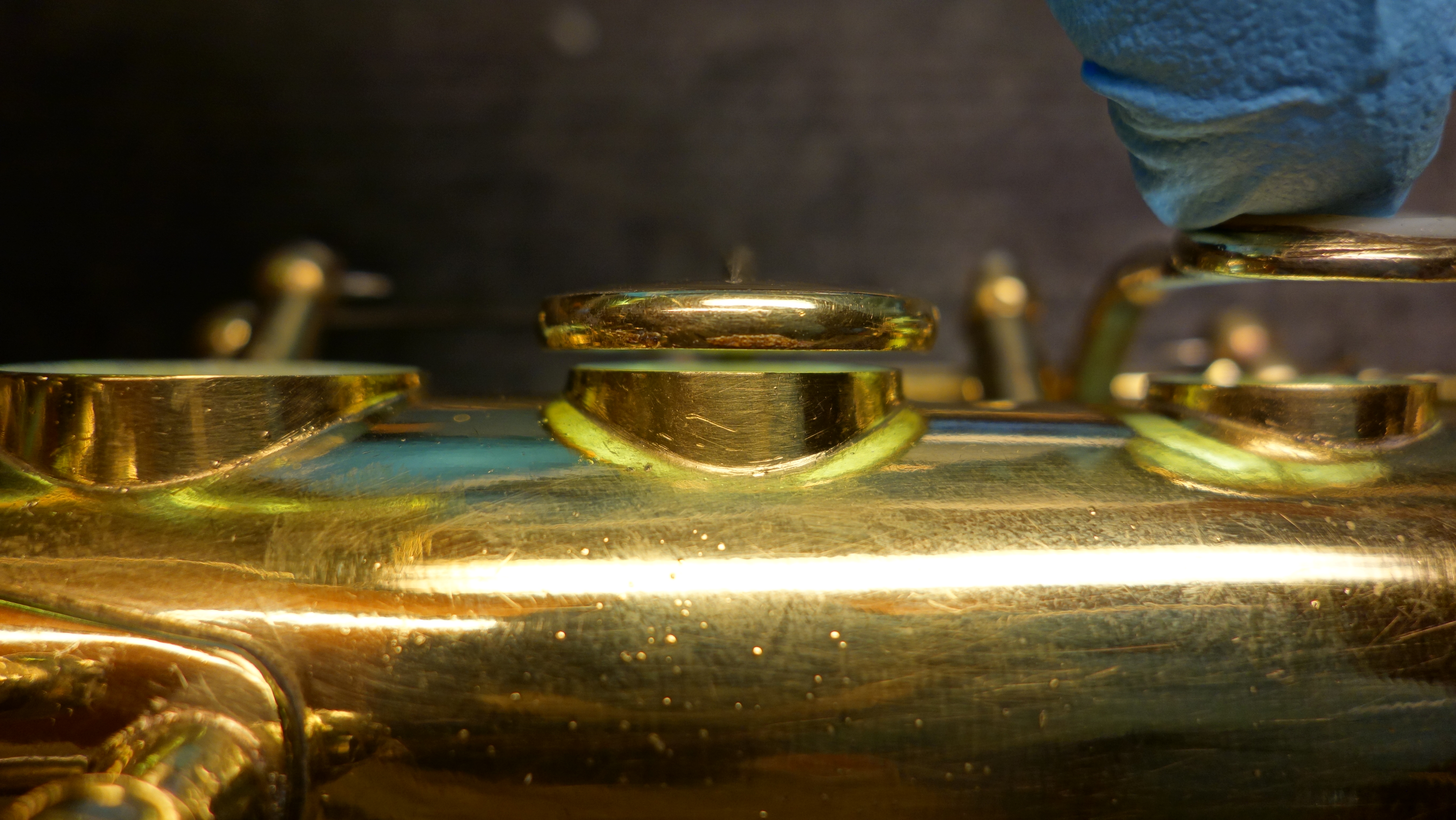 [caption id=“attachment_409” align=“aligncenter” width=“720”] A pad cup in the proper orientation, level and centered over the tonehole with the appropriate distance from the tonehole to the back of the key cup for a .160" pad and a thin layer of adhesive. This is a gold plated 1932 Selmer, and not a single one of the pad cups started off this way! Selmers are interesting in that from the factory they are actually set up for graduated thickness pads (thinner up top and getting thicker toward the bottom of the horn), and unless a repairer is aware of this typically every pad cup will get bent to use one thickness, typically .185, which is too thick for the upper stack.[/caption]