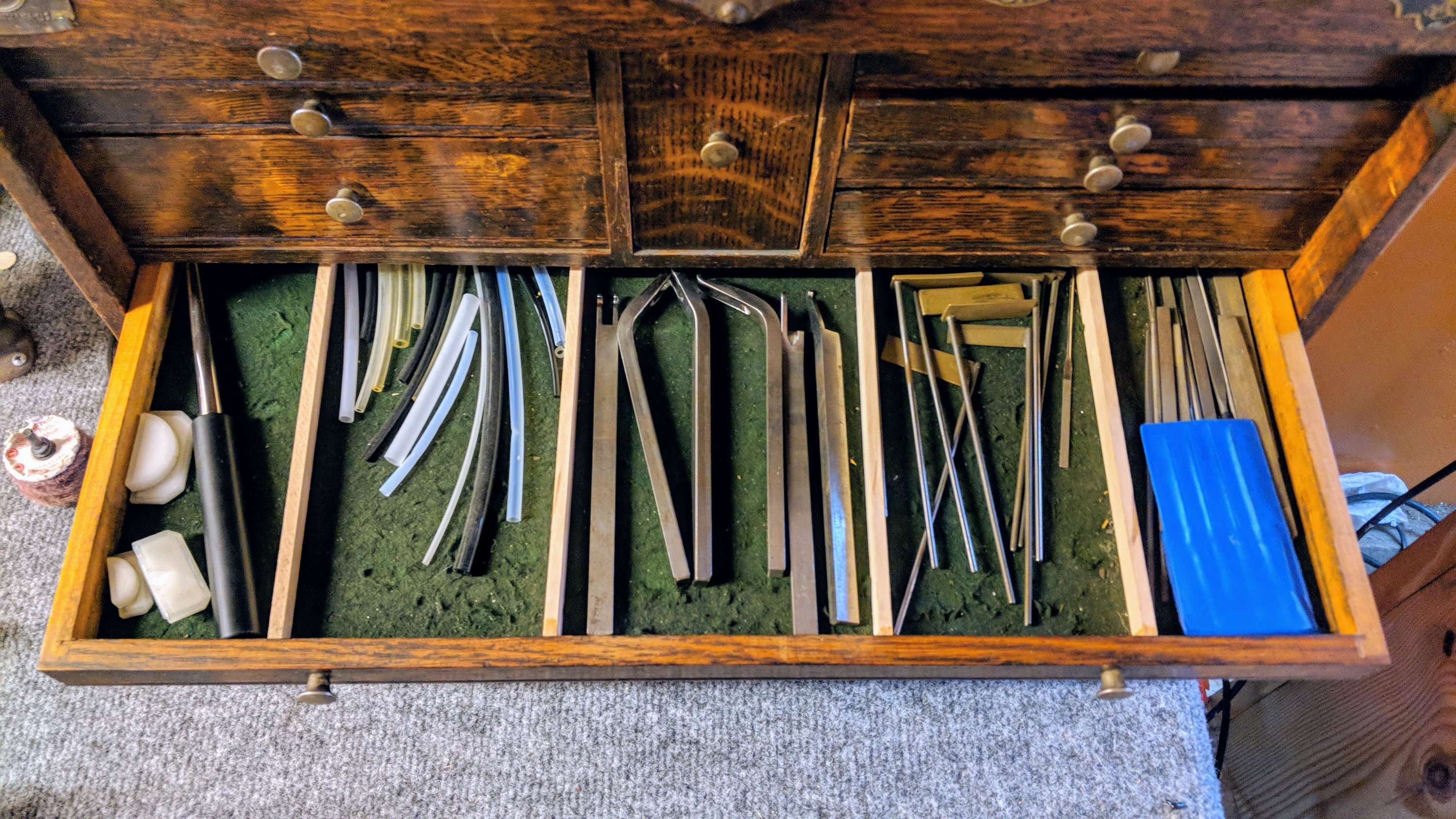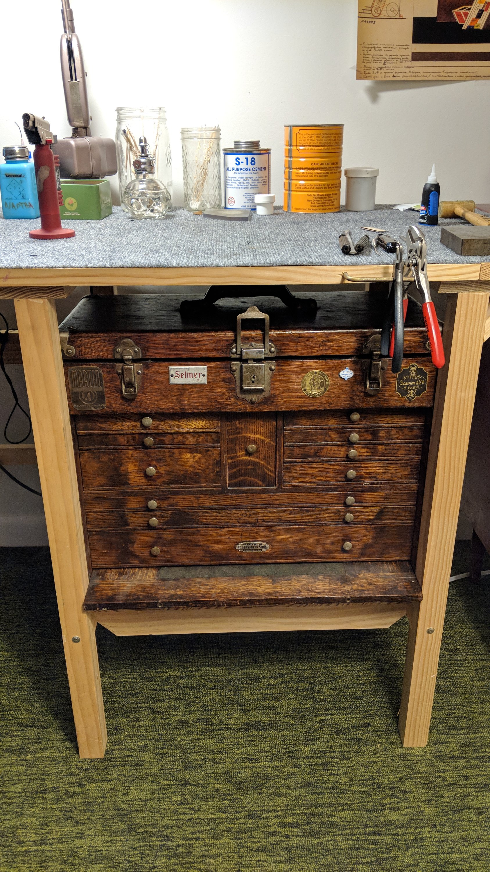 Even though I work in a workshop about 50 feet from my front door, sometimes I work from a backup bench in my house- in inclement weather, or perhaps I am feeling lazy. I have an old toolbox where I keep my most-used tools, and over time I have honed it into a fairly complete set of what can get me through 90% or so of my work- once dentwork and cleaning has been taken care of, anyhow. In the event that you find it interesting to know, check through the photos below to see what my personal toolbox contains.