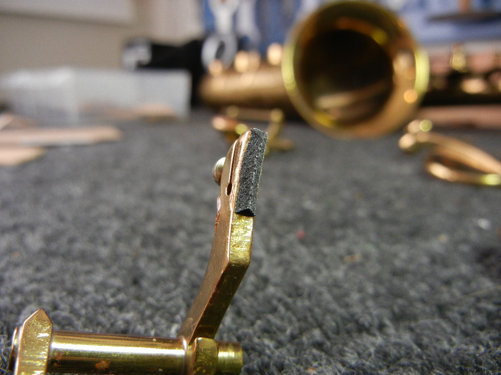 Forgetful or spongy materials like natural cork or that spongy synthetic cork stuff are also useful to some folks in order to make up for sloppy work in force transmission adjustments: just put a cork slightly too thick for what is needed and let time and the energy of the player (or clamps) do the rest of the job- it will feel spongy under the fingers, but it will make the player work hard enough to squeeze the leaks shut. Take a look at most new horns, for instance. See how the corks in many places are the same exact thickness? Perhaps their manufacturing tolerances are so close that they can use the same thickness of cork on all their stack adjustments? Think again, champ. They seat the pads, install pre-cut corks and clamp it so it compresses during shipping to be the thickness it needs to be by the time you open it up. Only problem is it doesn’t, and it isn’t. It is close, sure, but its not right. But taking the time to make each adjustment material perfectly fit the exact situation of that particular horn costs too much for the manufacturer in most cases, which is why you are reading this article on the website of a repairman.