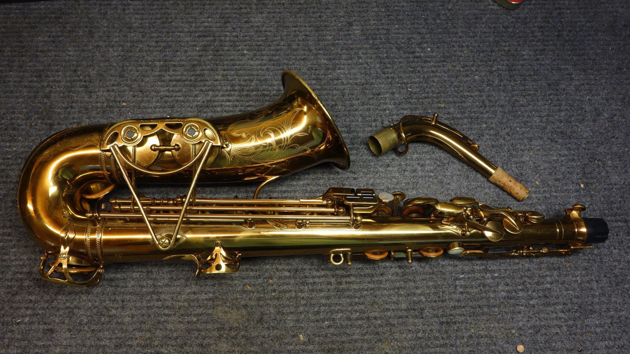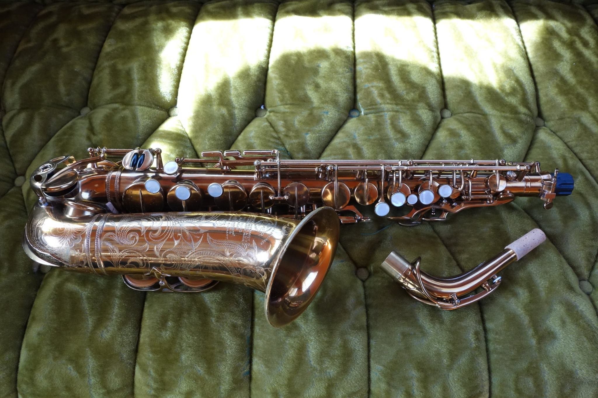 Well here is a horn you don’t see every day. This is a Selmer “Dorsey Model” alto saxophone in what I believe to be a very old factory relacquer- though done extremely well and color-correct so most folks wouldn’t be able to tell, and even a few professionals might be fooled.