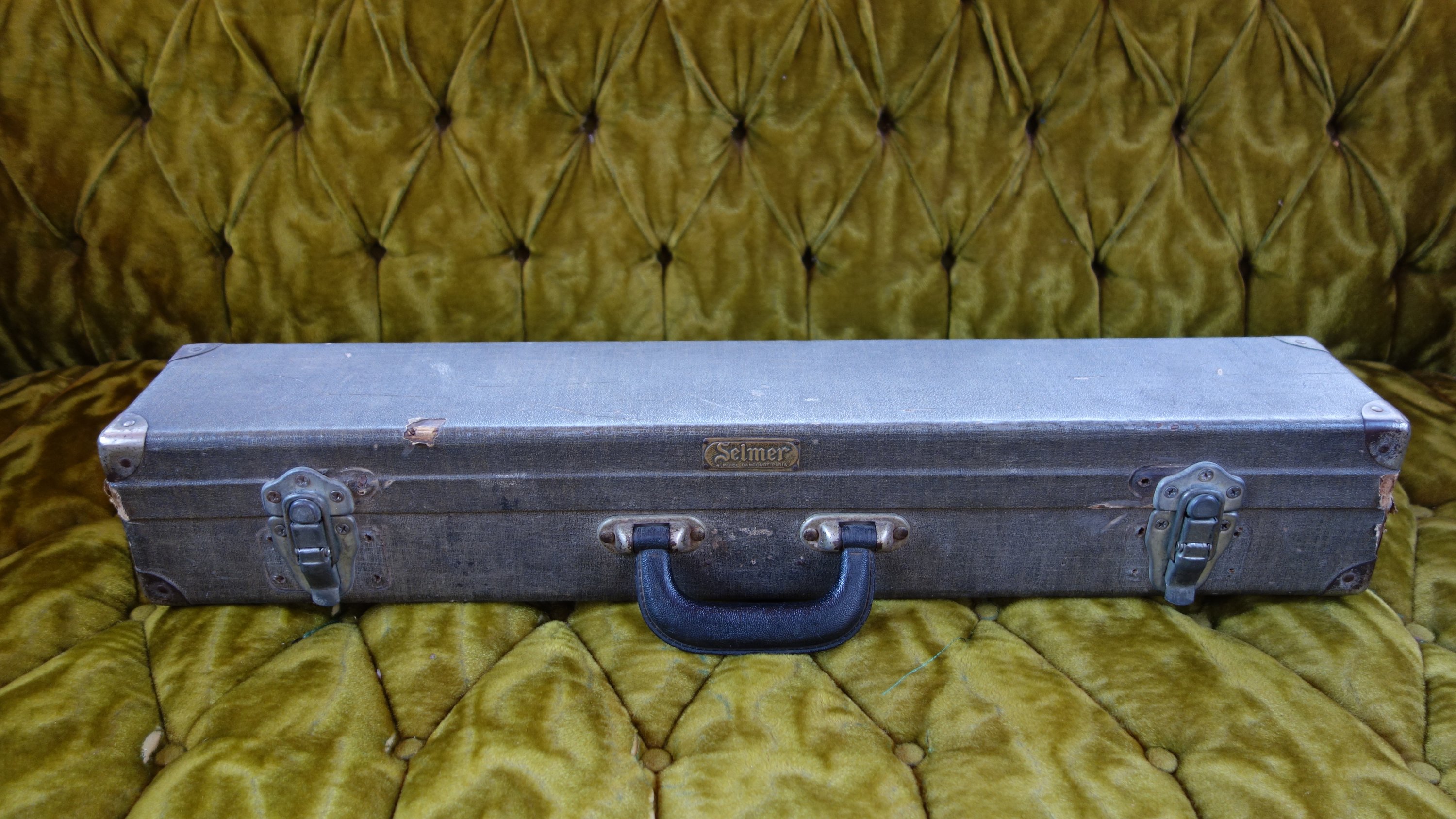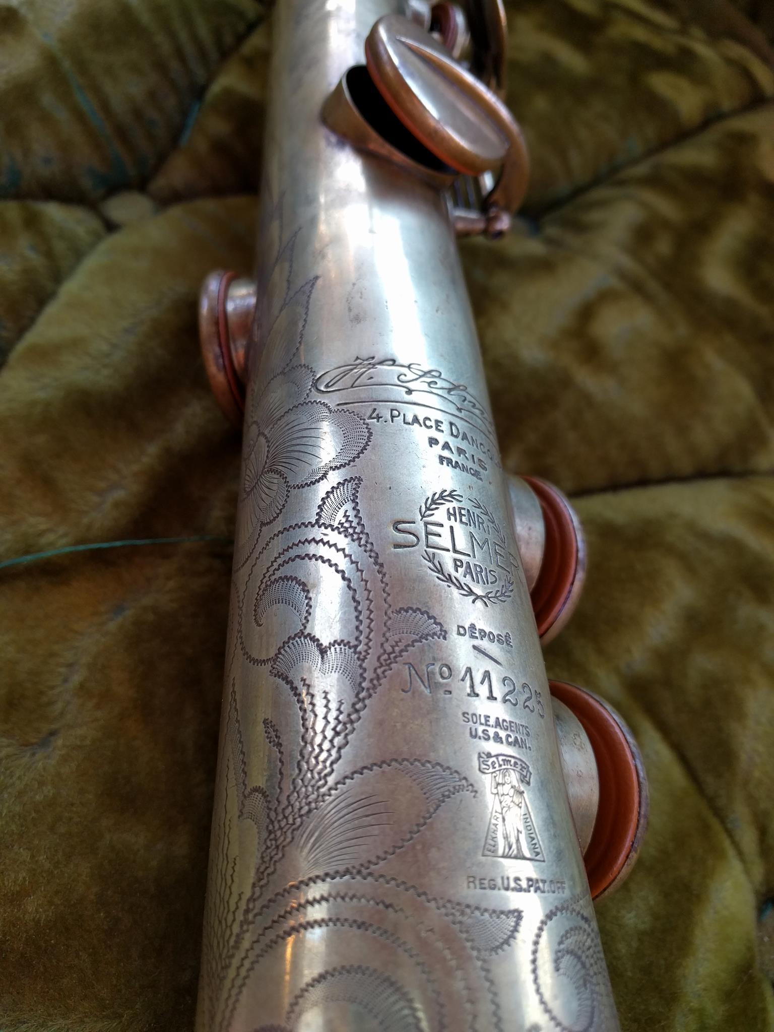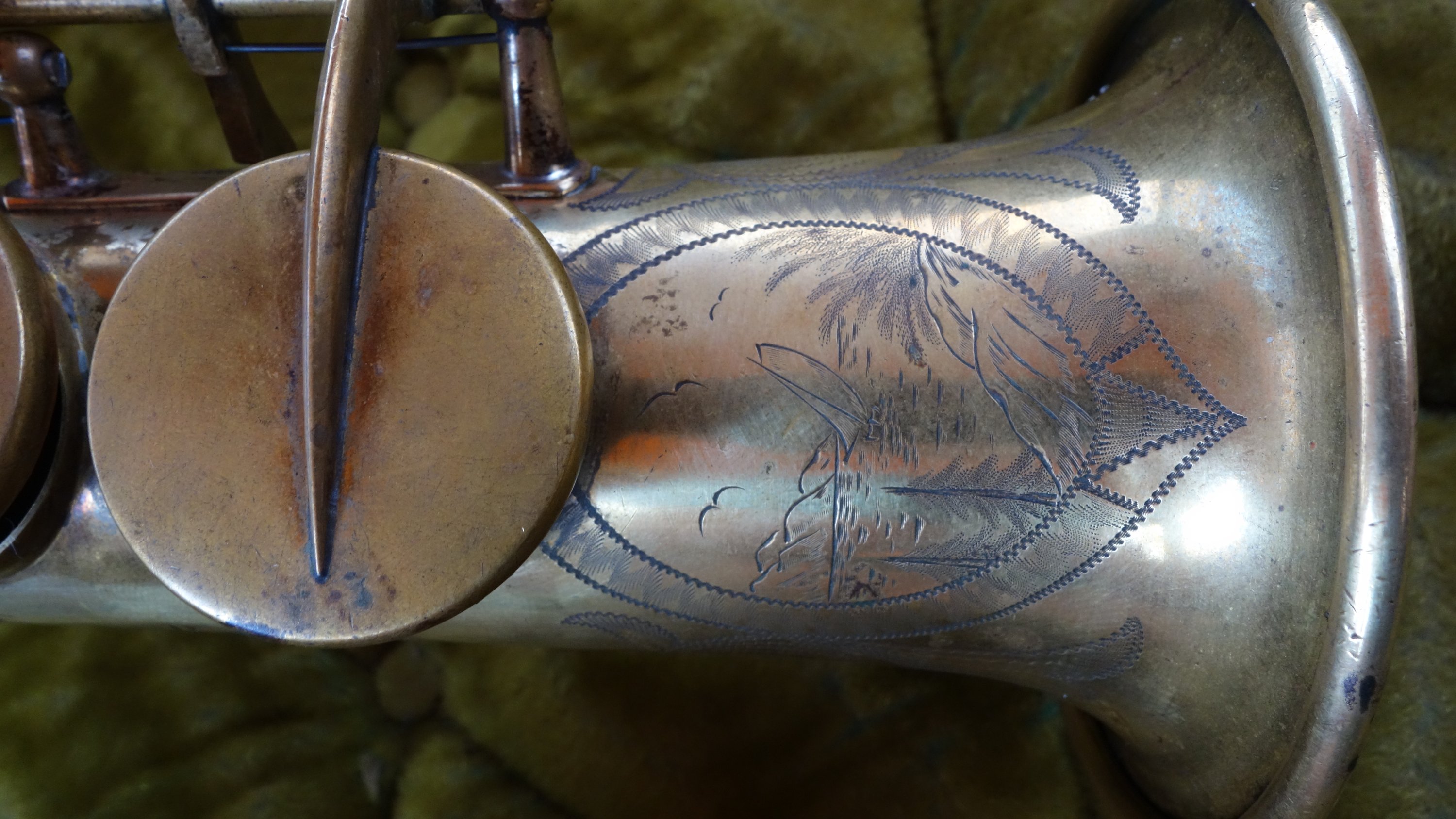 This unique horn was made in 1929 during the time period that the “New Largebore” Selmer was being made, but sat unfinished and unsold at the factory until the late 1930s, when it was finished, given a contemporary engraving pattern of the Balanced Action, and sold. Thus the engraving is out-of-time, but completely original.
