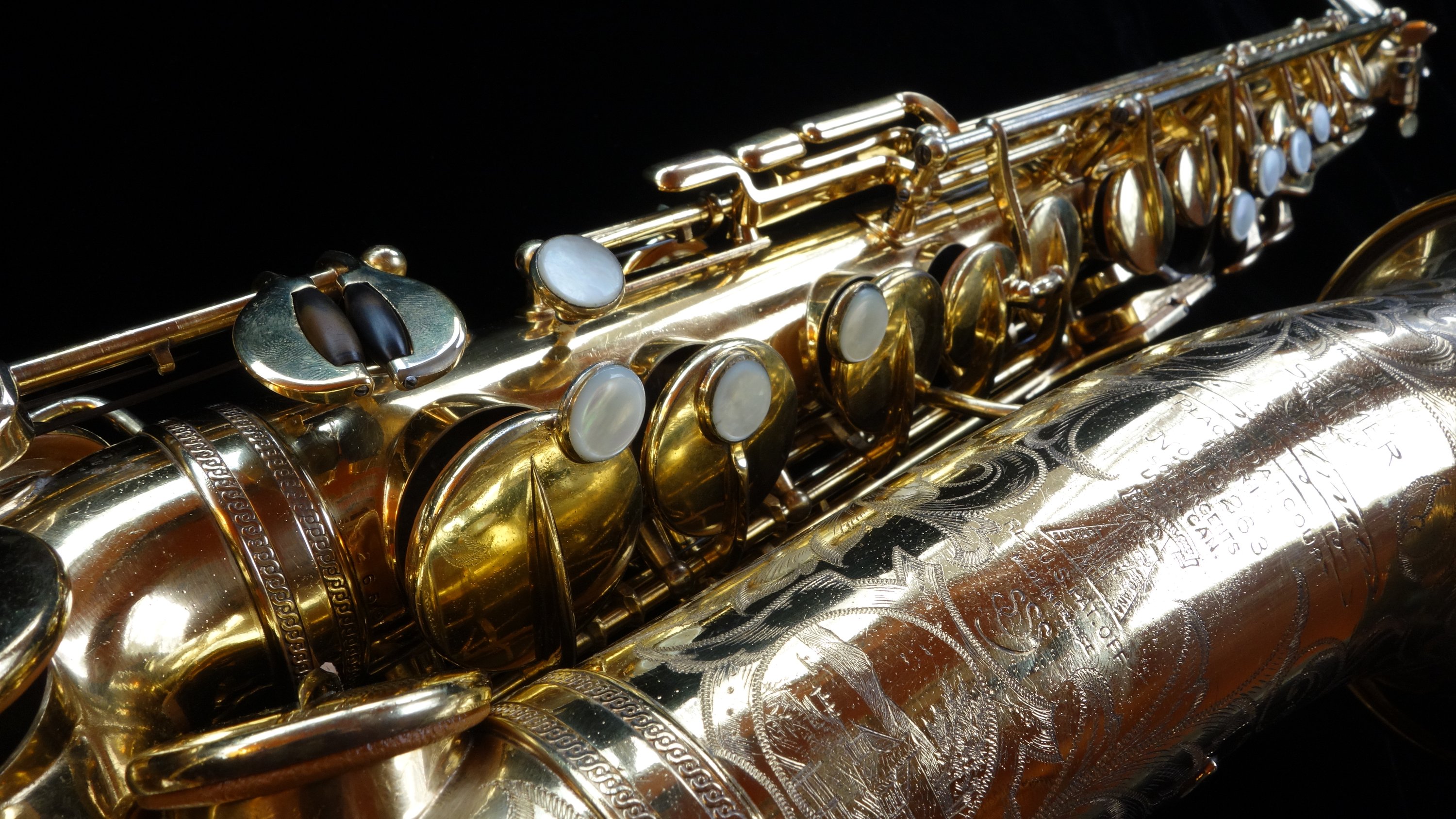 This is a Selmer Radio Improved model alto saxophone in burnished gold plate with the American style engraving. This is one of probably between two and five saxophones of this model ever made with this finish and engraving pattern, and likely the only saxophone with this exact engraving scene as they were typically a little different from one to the next.