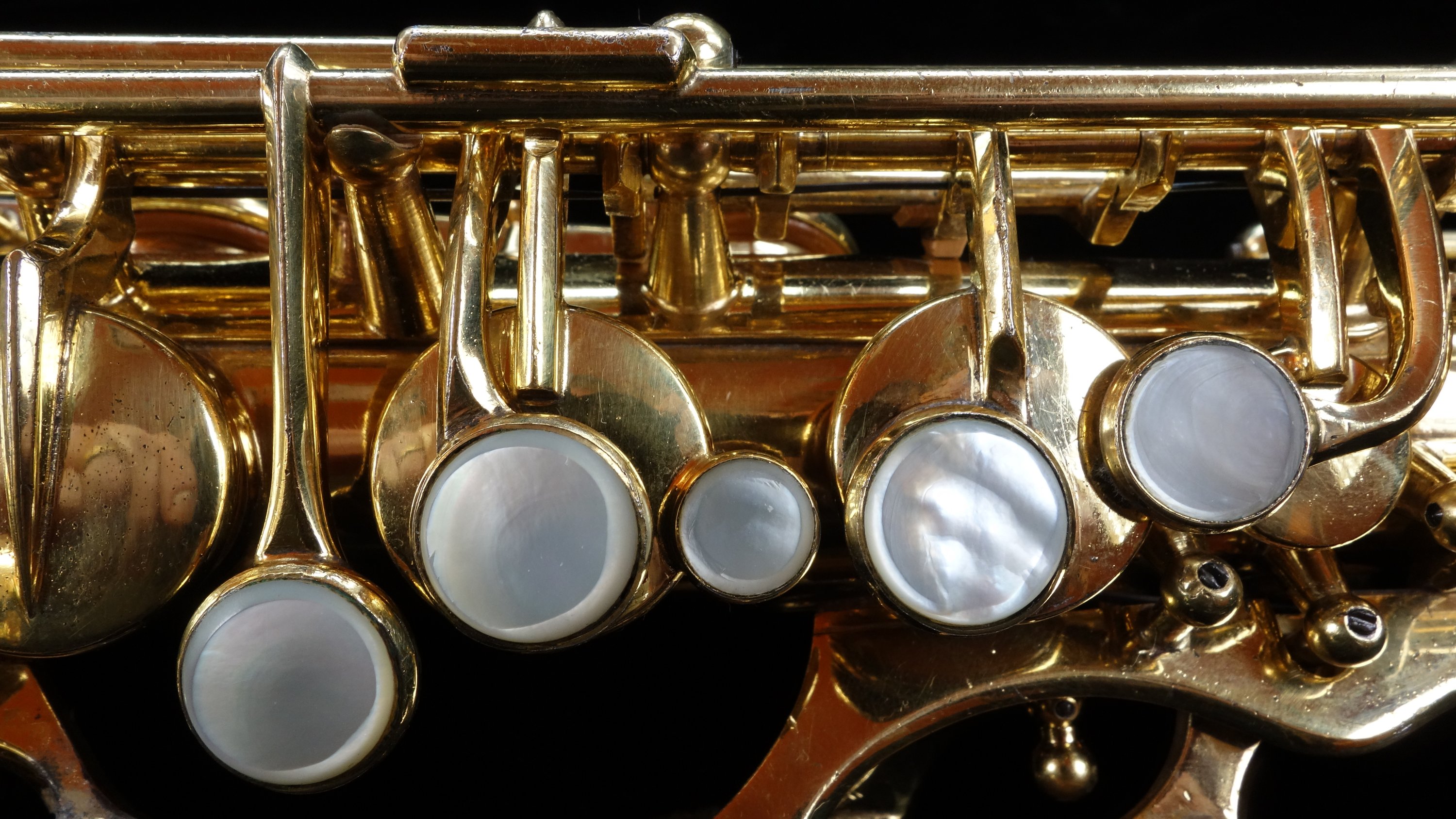 This was a whale of a job- while in good physical condition with its original finish, it was clear that this saxophone had been played a lot and a full mechanical rebuild was in order. Several pearls were replaced, and I remade the G# pearl holder (which has been removed at some point and replaced with a rather crude spatula) and installed a new pearl. Also the key guards had been resoldered at some point in the past, and cleaning that up, straightening them all out, and redoing it as best as I could took a fair bit of time.