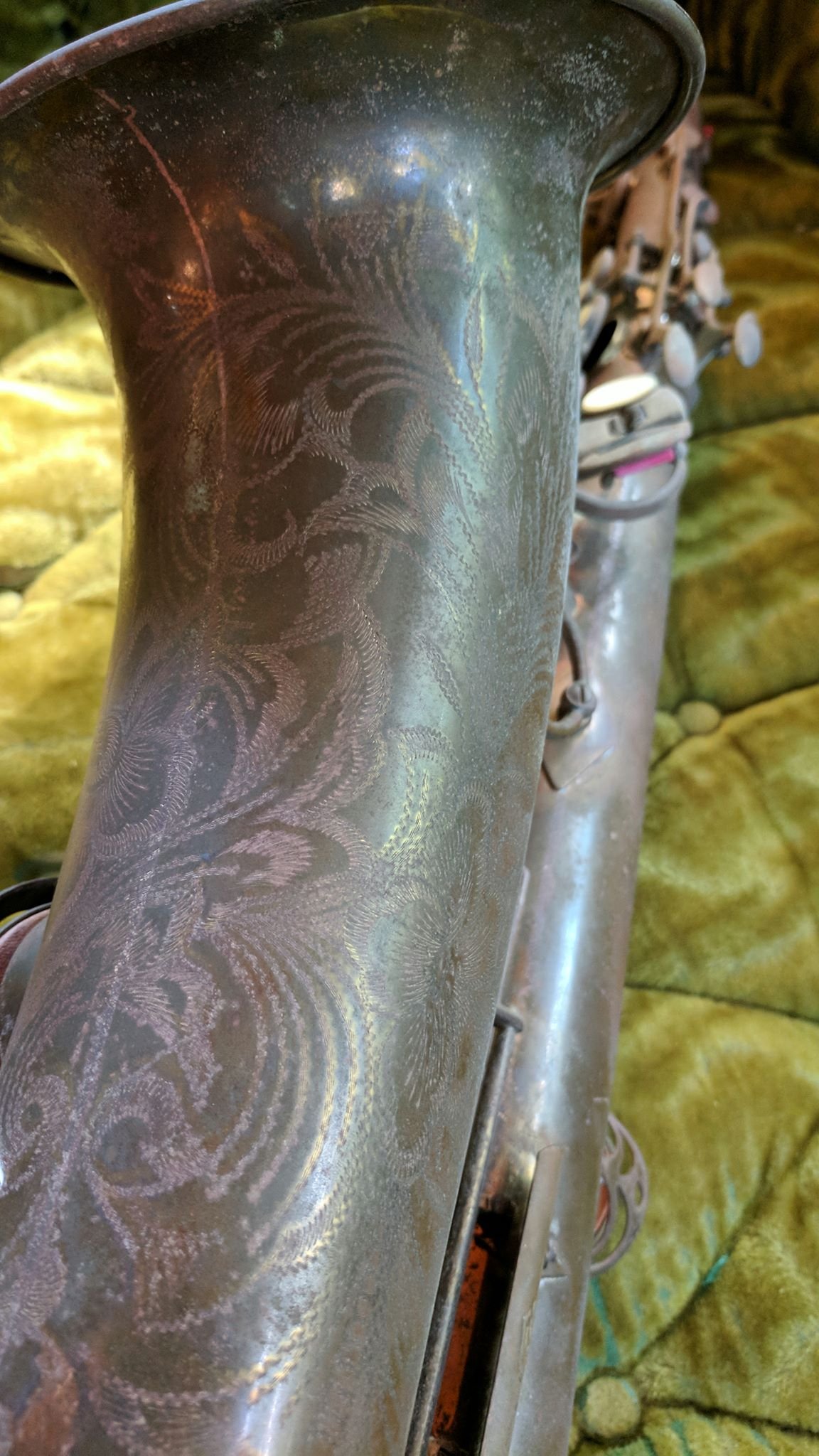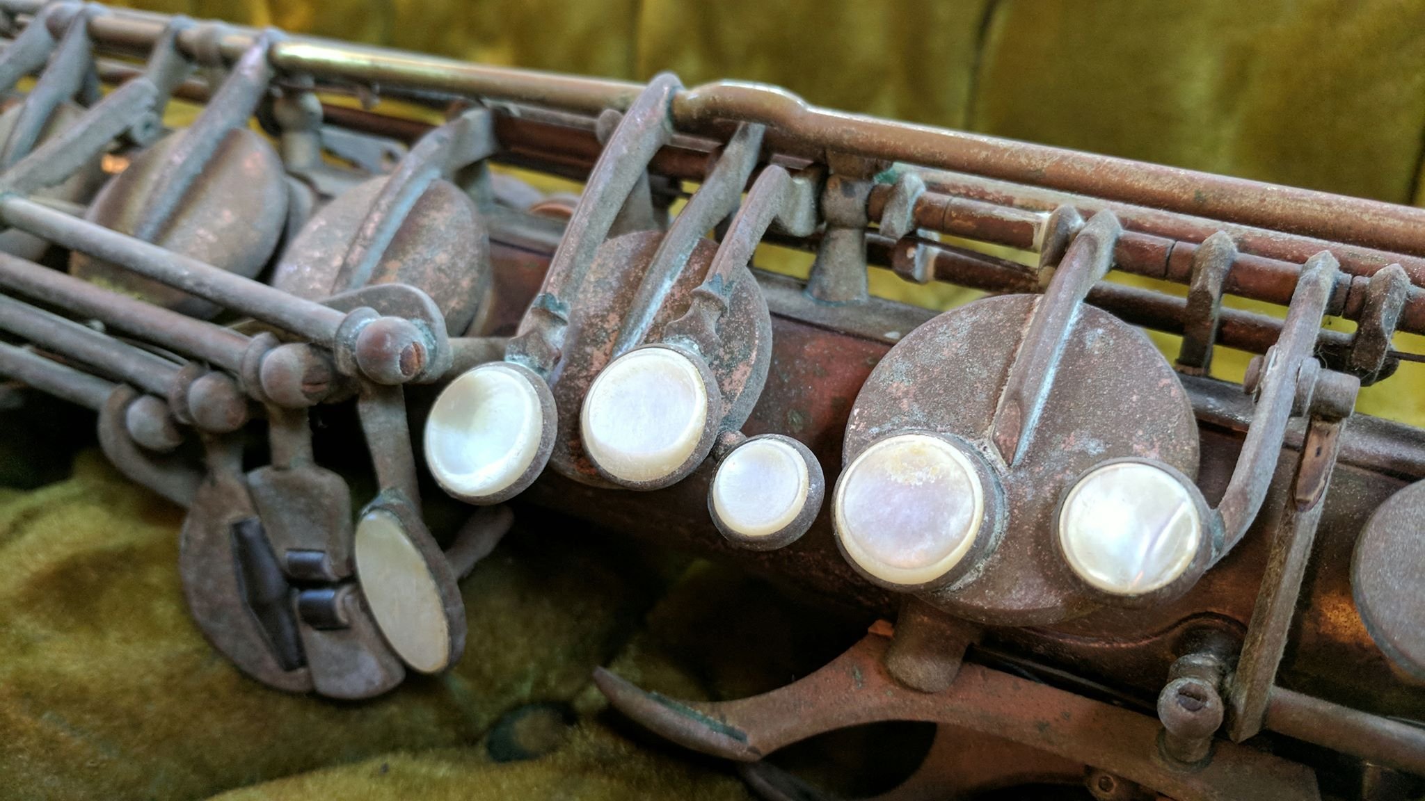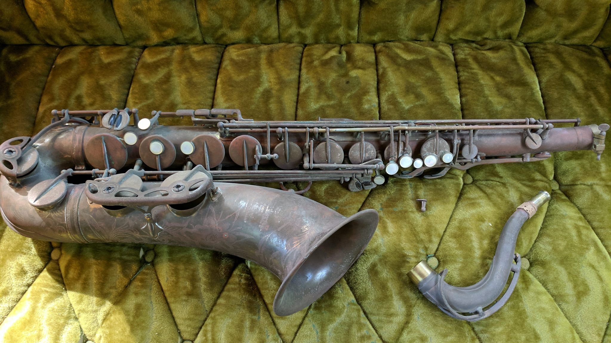 This horn came to me after having lived as a wall decoration for several decades. It was completely rusted and seized up in a way that I have only seen in other saxes that were exposed to the weather or submerged at one point. The kicker was it had original pads in it, so it was pristine when it got hung up- and in the before pictures, you can see a lot of the original lacquer, though so damaged by corrosion and exposure your hands would come away brown when handling it.