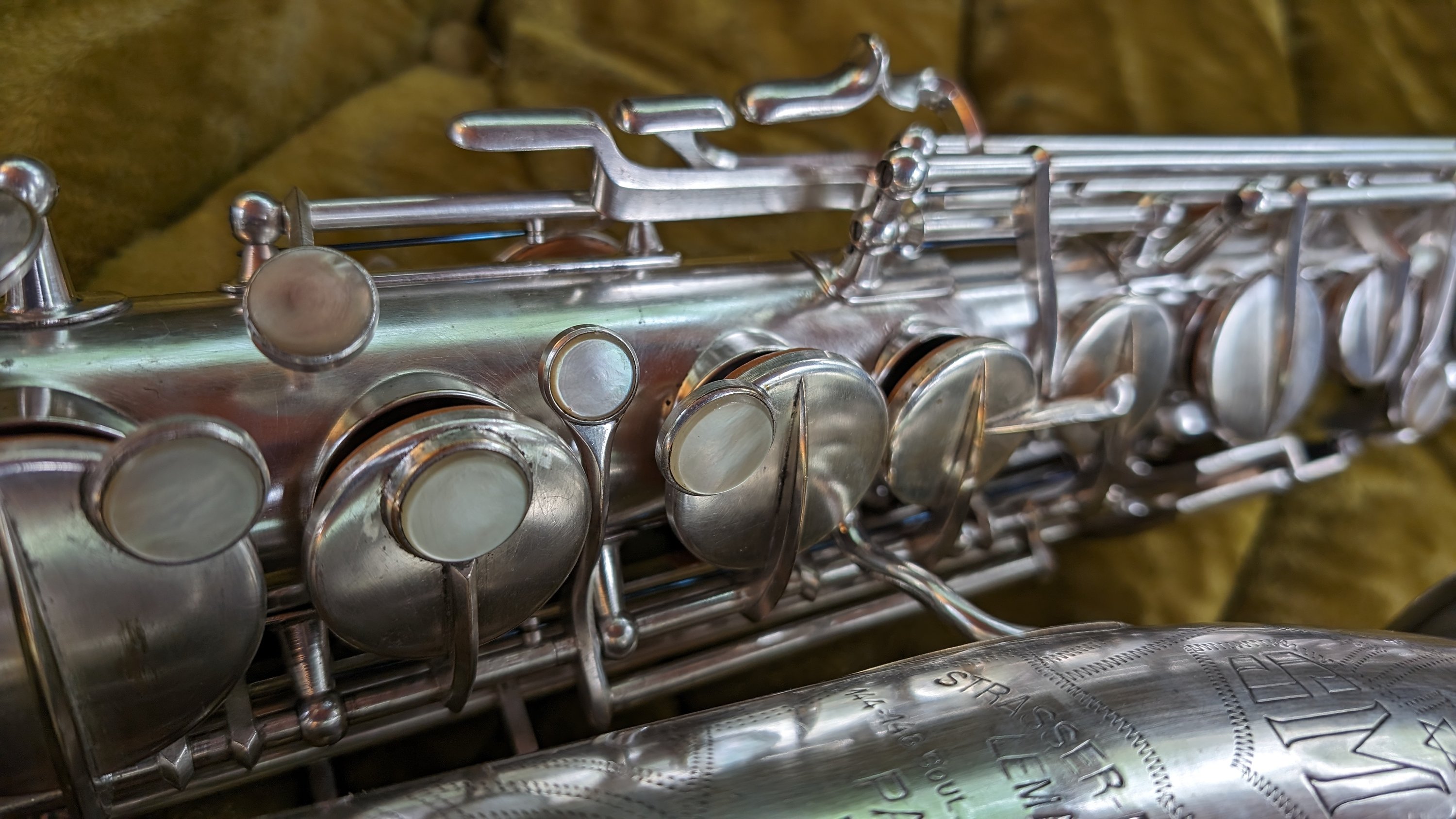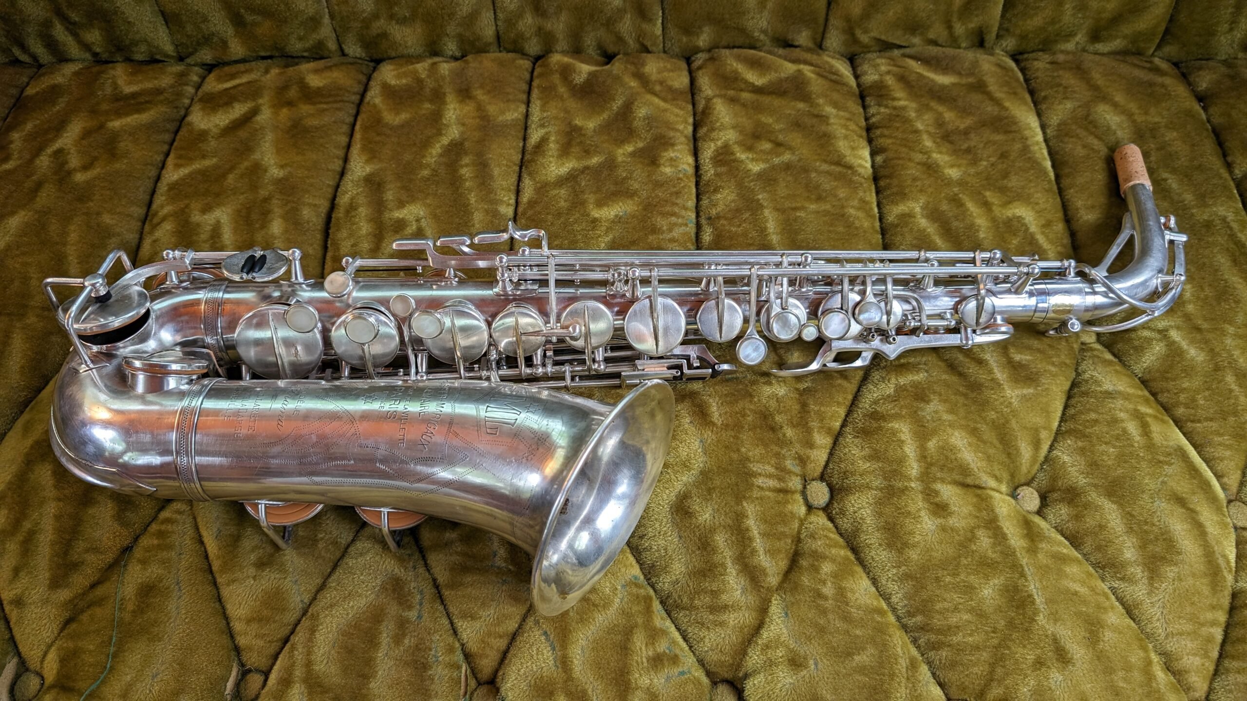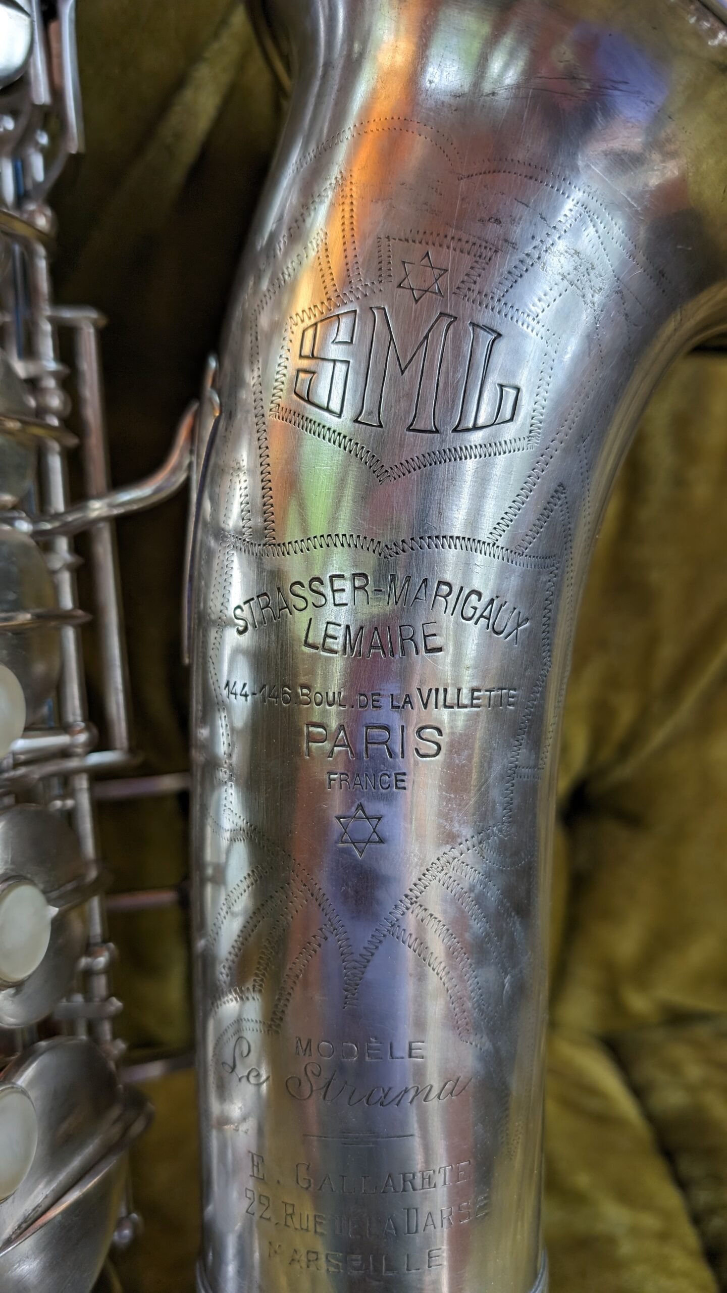 Early SML alto with left hand bell keys, says “Le Strama” on the bell. Looks nearly exactly like the horn they used to make the early “Coleman Hawkins Special” alto- I say nearly exactly because I cannot be certain it is exactly the same, but I do not see any differences myself. These horns are somewhat challenging to work on, but they are some of the only saxophones I have encountered that can even be considered in the same league as a Conn New Wonder I or II for fatness of tone, while also having a certain “French” color to the sound. Super fun to play.