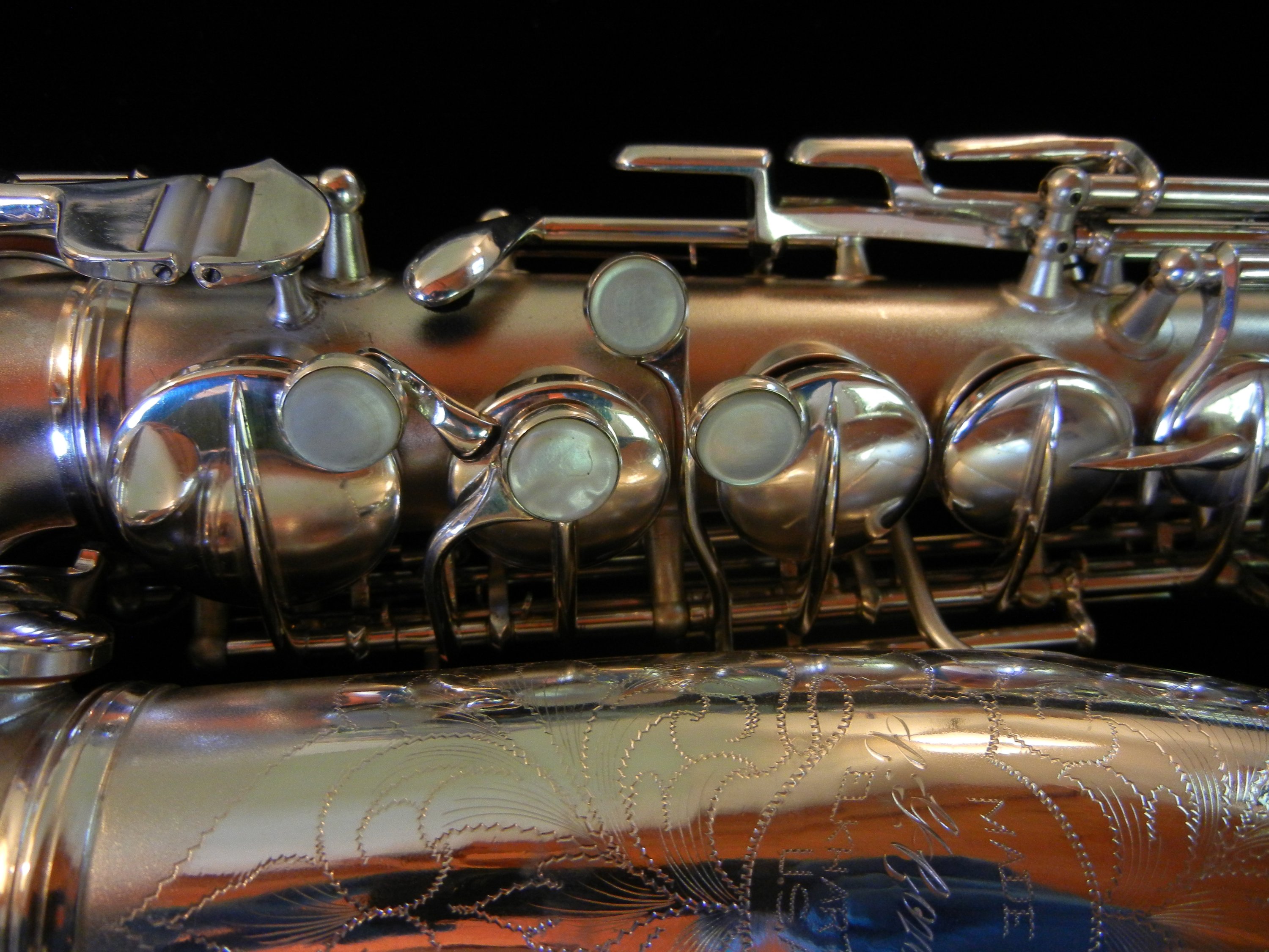 These saxophones in the unusual key of F were introduced months before the market crash of 1928, and only a few were sold- to those rare customers who were both saxophone crazy* and* had disposable income during the Great Depression. The unsold horns- which were the majority- were used as fodder at the Conn repair school. As a result, not many of these unique instruments survive, and even fewer still in this condition.