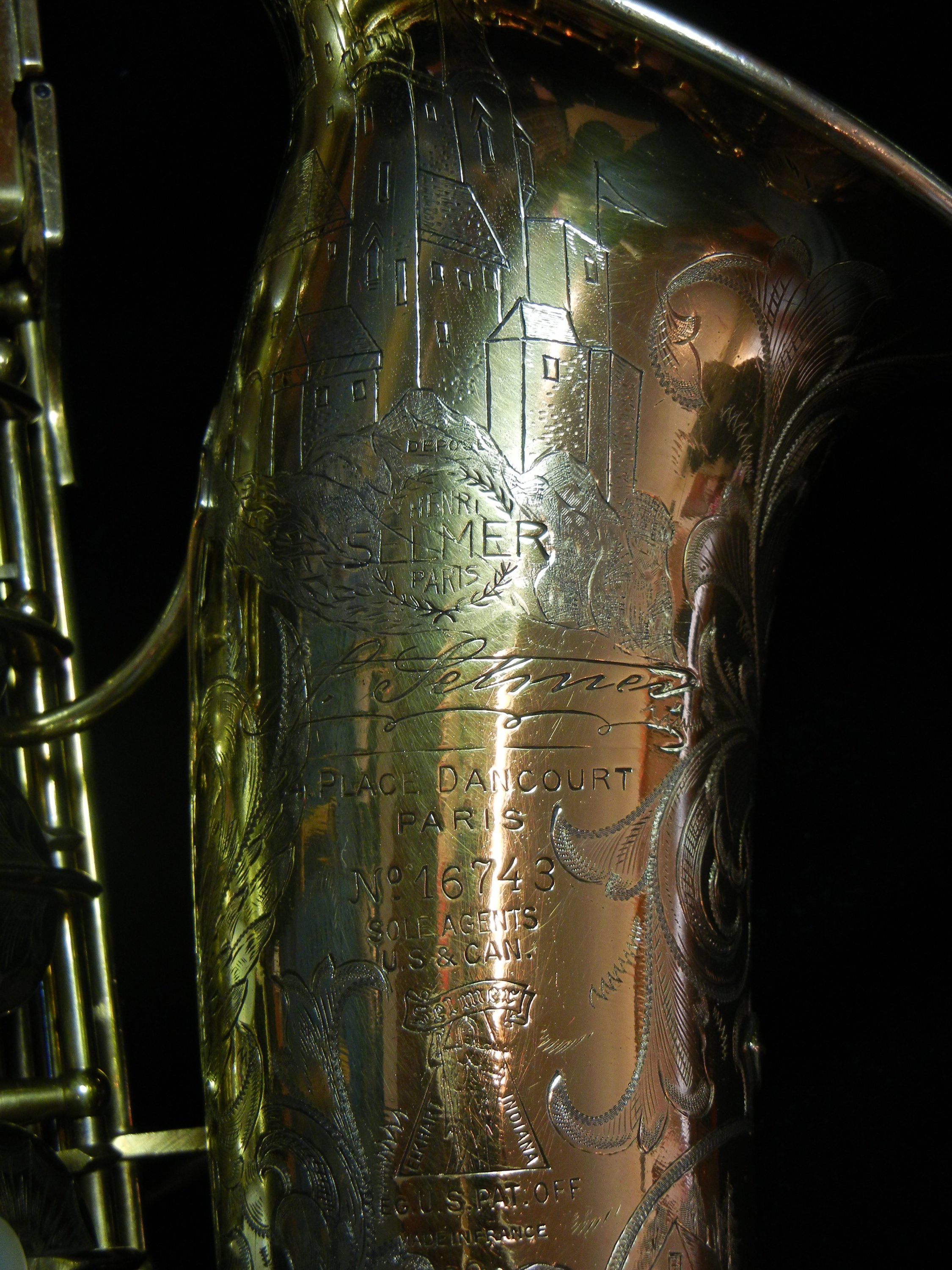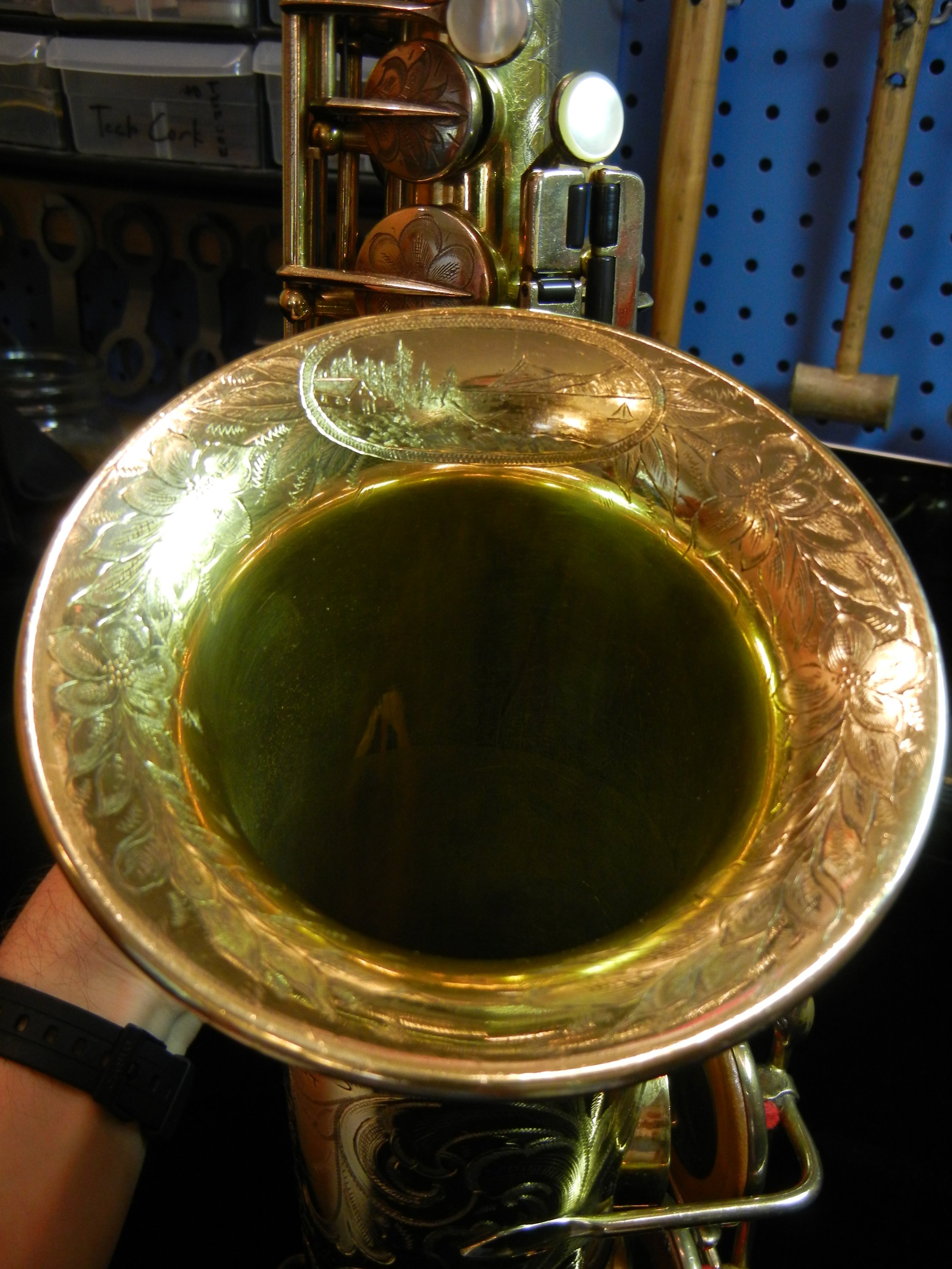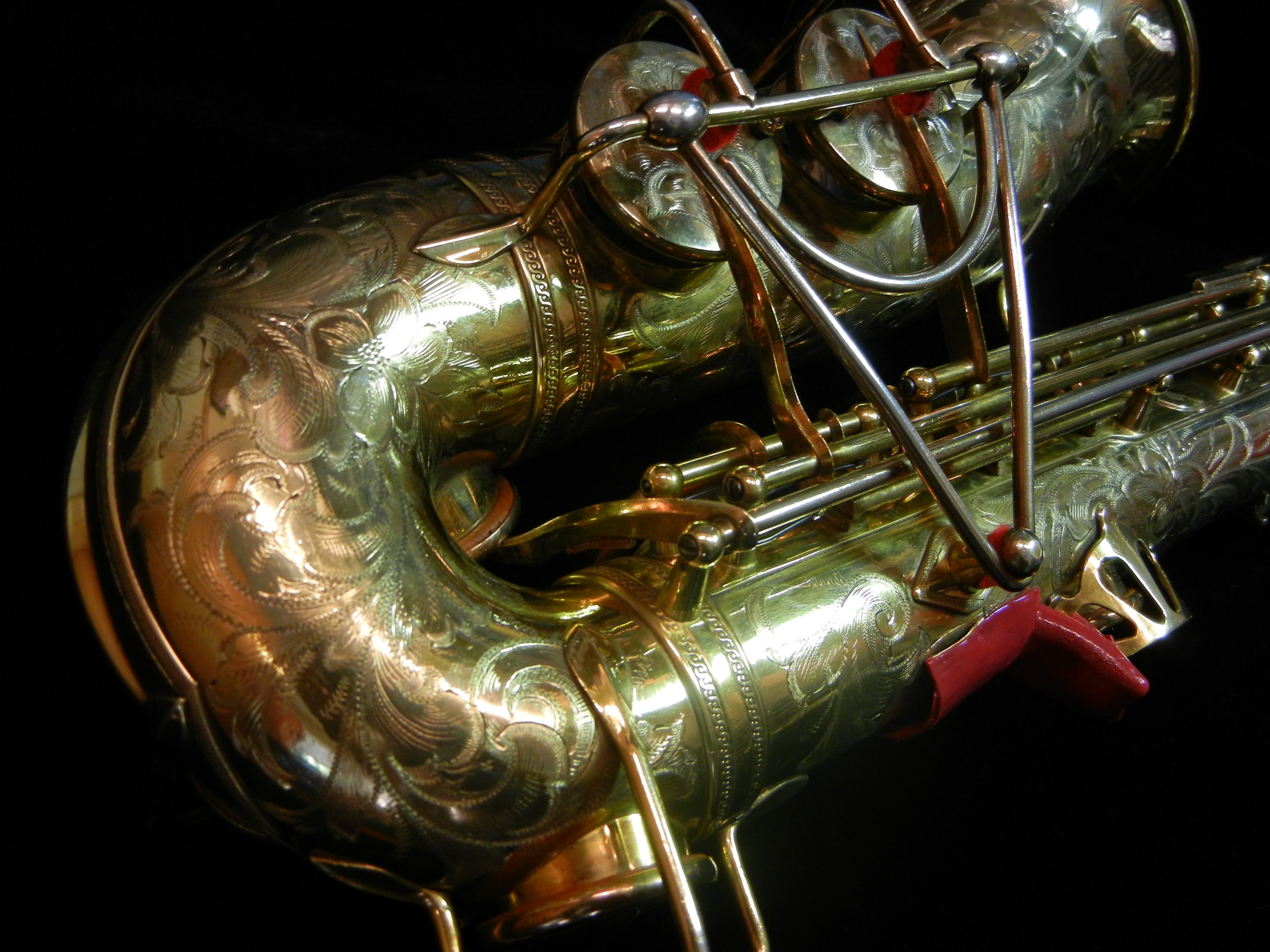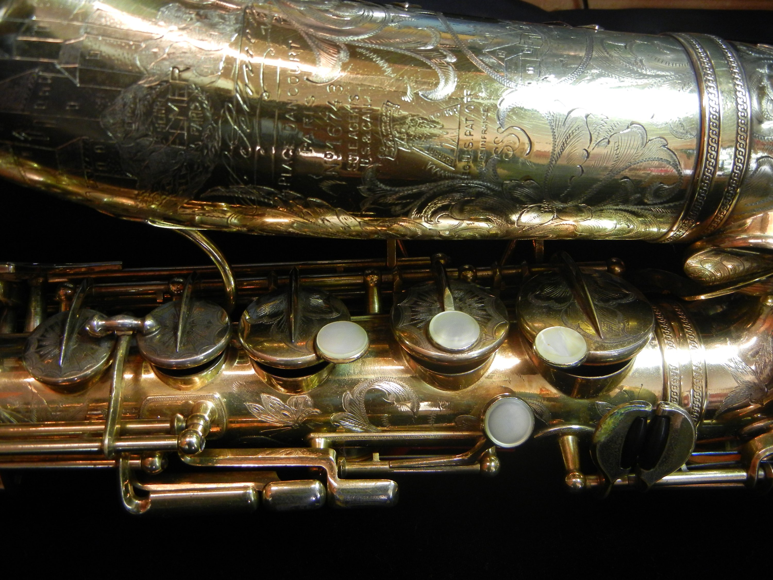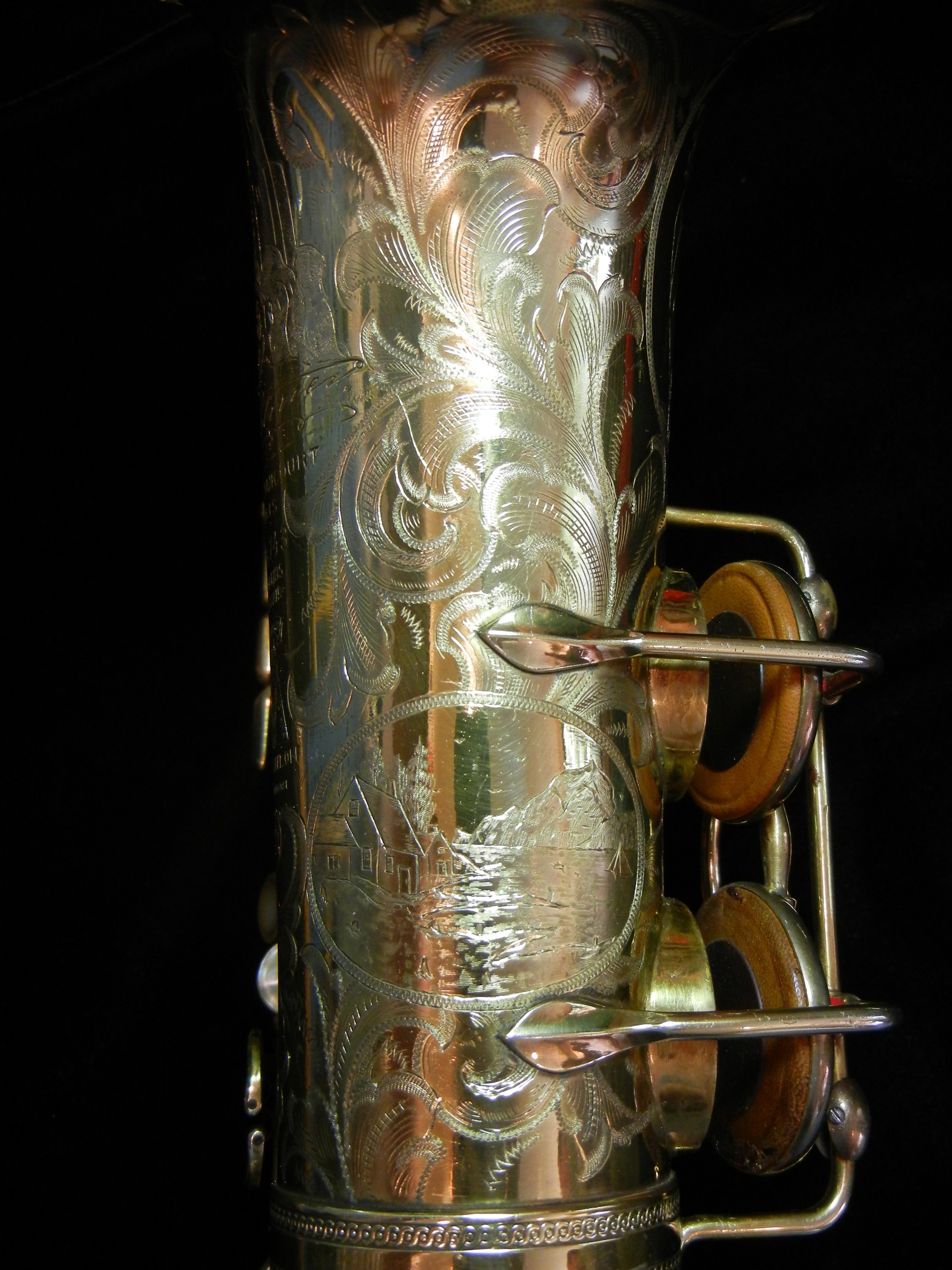 I am lucky enough to work with and see many beautiful and rare saxophones, and these days it takes something rather special to make my jaw truly drop. This past week, completely unexpectedly, a saxophone came through my shop which is about as rare and as beautiful as any saxophone out there, and I am extremely happy to share it with you: a one-of-a-kind 1932 Selmer Super Sax of the “Cigar Cutter” variety, fully engraved from the neck cork to the bell rim, including every single pad cup (yes, even the octave pad cups) and the post feet.