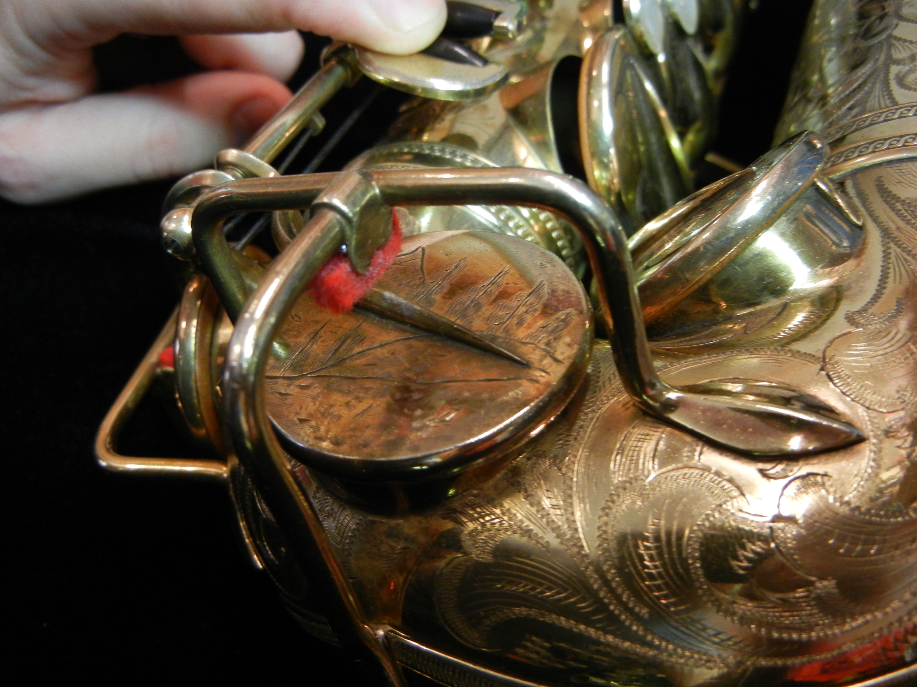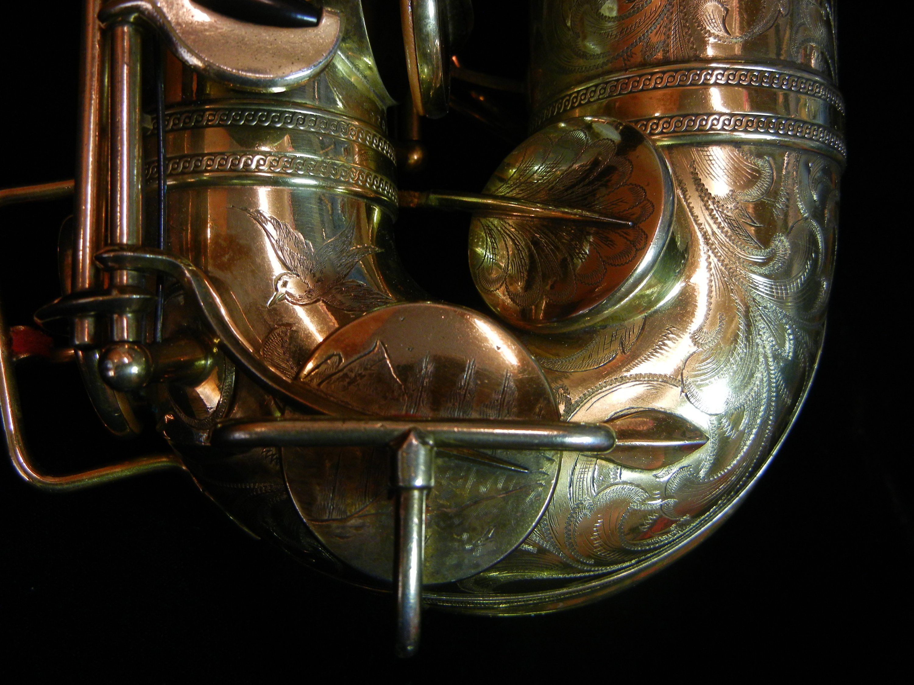 Comparing the engraving to similar motifs found on Conn and King saxophones of the previous decade, it looks as if Selmer Paris’s USA arm in Elkhart (which is vastly different from today’s Conn-Selmer USA) brought in an engraver from Conn to turn this saxophone into the beautiful work of art it is now, and the horn was disassembled in order to do the work. The nude portrait as well as the patterns on the keys (see Conn key engraving patterns here) are extremely similar to earlier Conn work, most notably the fully engraved “Virtuoso Deluxe” finish option. However, unlike the Conn “Virtuso Deluxe” models with similar full engraving, this saxophone appears to be a one-off, and to my knowledge (and the knowledge of several other saxophone experts) this may be the only one of its kind. In fact, even Selmer Paris is aware of this saxophone, and has asked the owner if they can acquire it for their museum in Paris! However, this saxophone is not for sale.
