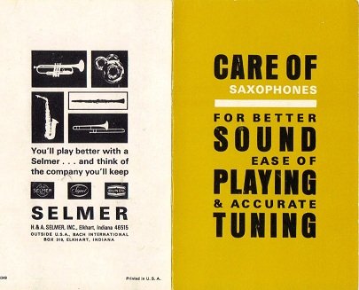 I love original literature, be it ads or booklets or price lists, and I collect them as I come across them. Here are some high-quality scans of the booklets that would have come with your new Selmer Mark VI saxophone. Click on any image for a high resolution version.