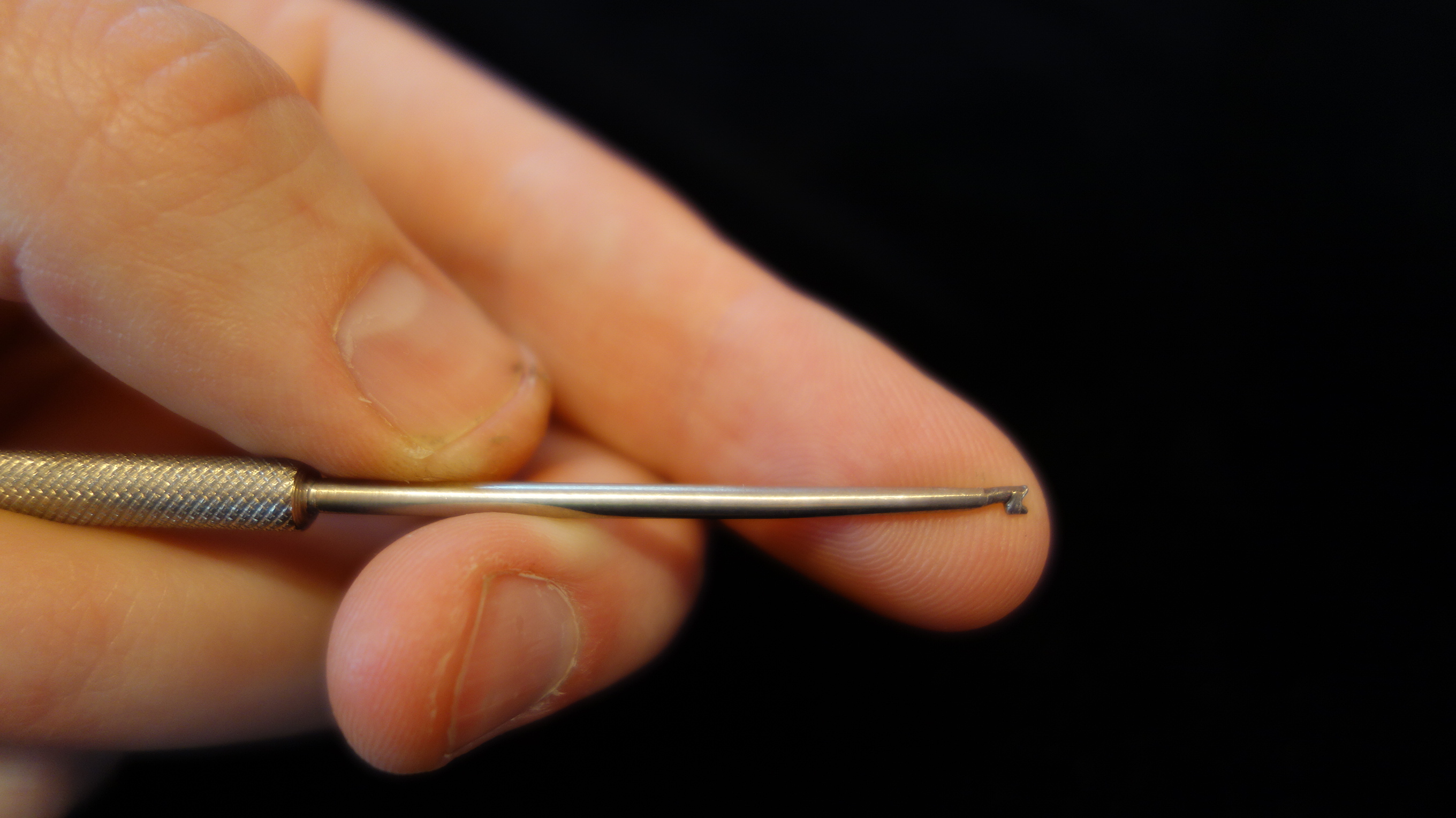 Spring Hook A tool for manipulating springs in and out of spring cradles while the saxophone is assembled. You can make your own out of a crochet hook with a small file, or you can buy one ready made. I forget where I got mine, but they are available at Ferree’s, Allied, Musicmedic, and many other places.