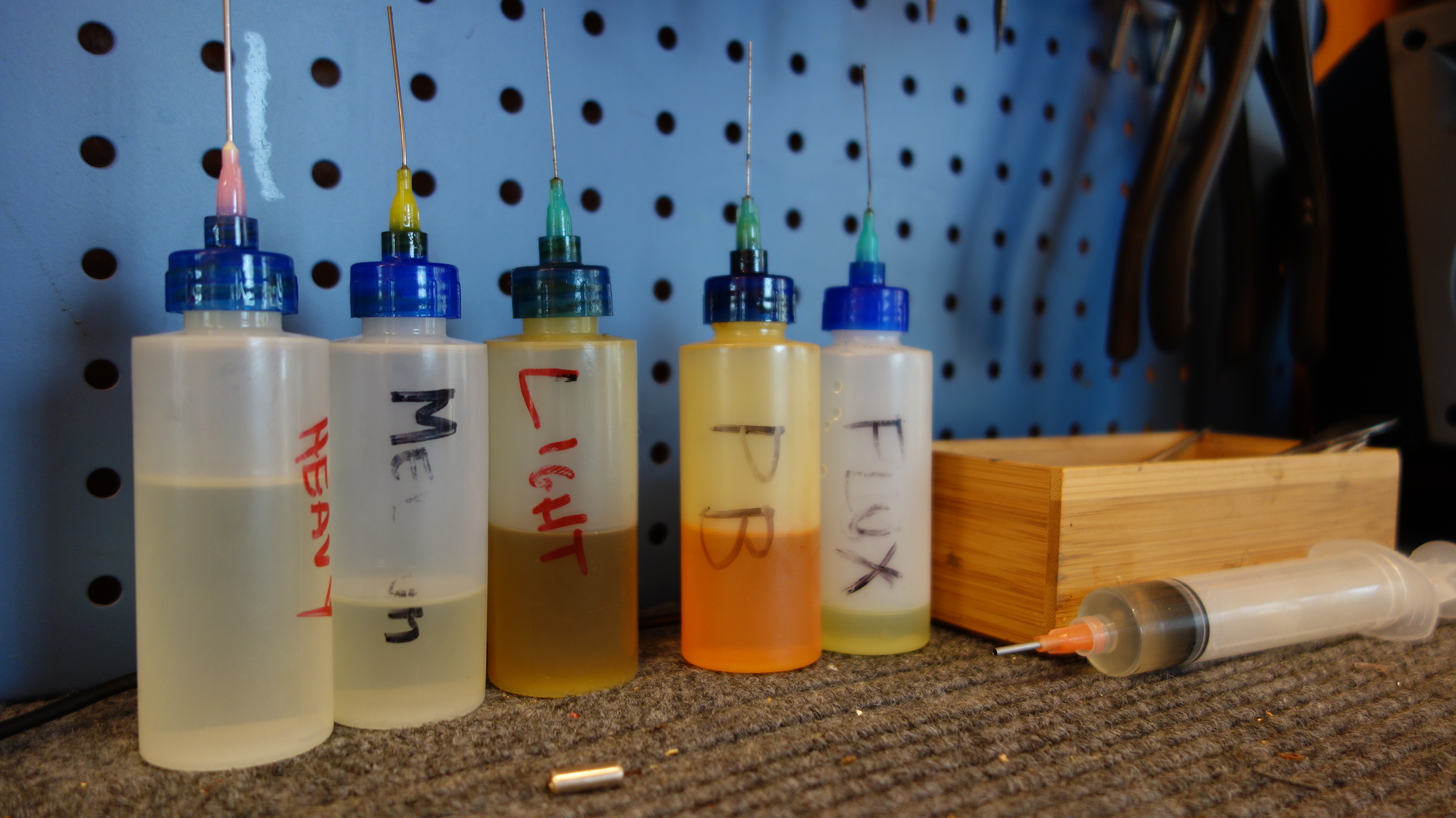 High quality key oil and pivot grease Lubricant for keys and pivot screws. Different thicknesses/viscosities/weights are used for different purposes. Suppliers include Kraus Music, Votaw Tool, Ferree’s Tools, Allied Supply, and MusicMedic. I use the oil from Kraus and MusicMedic, and I find I use the heavy weight oil most often. I use the pivot grease from MusicMedic, though I find it to be a bit sticky.