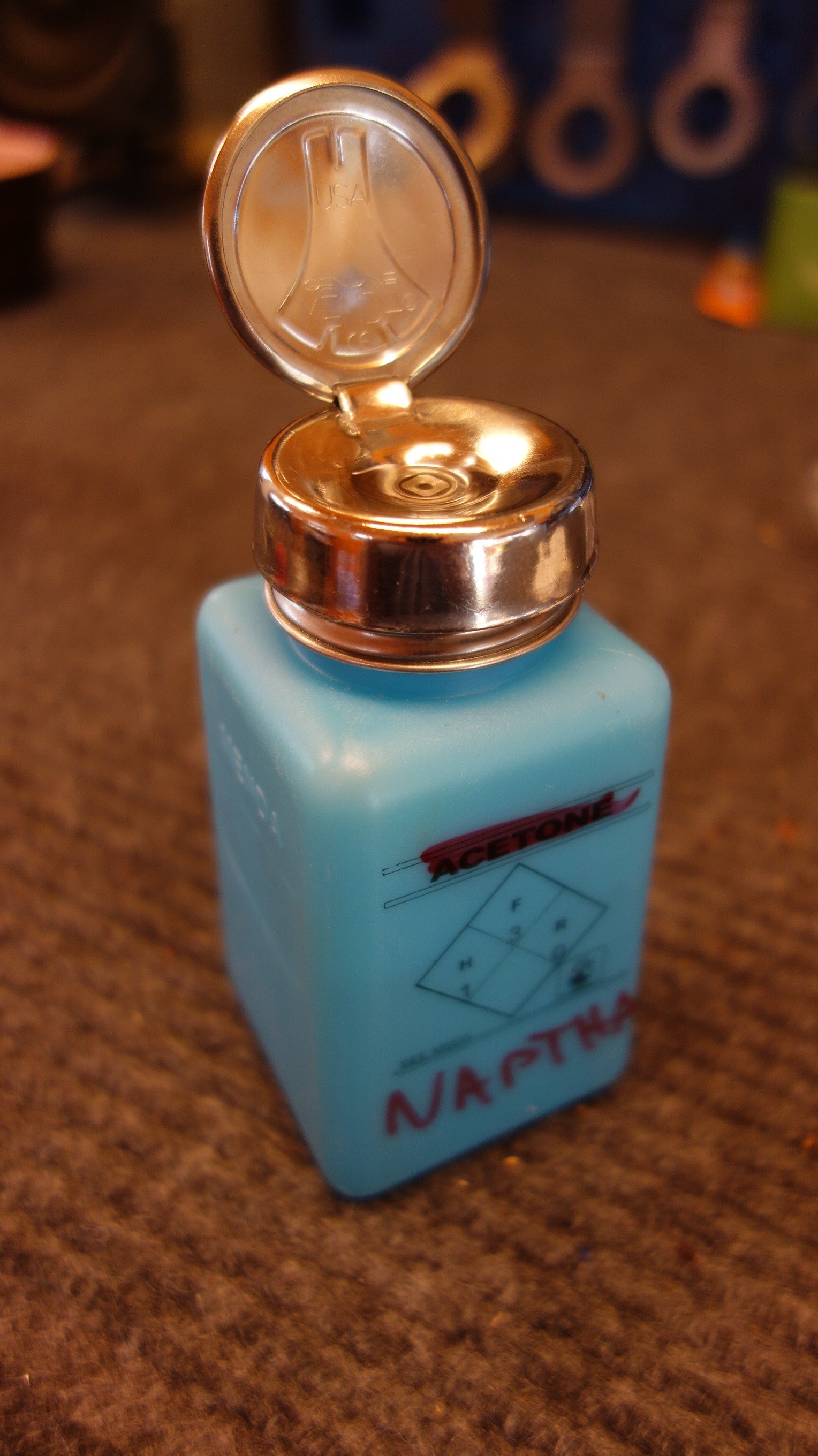 Naptha + dispenser Naptha and a dispenser for application to cotton swabs and pipe cleaners etc. for cleaning. Naptha available at your local hardware store, the dispenser I like best is the “Menda” brand solvent dispensers, available in various places.