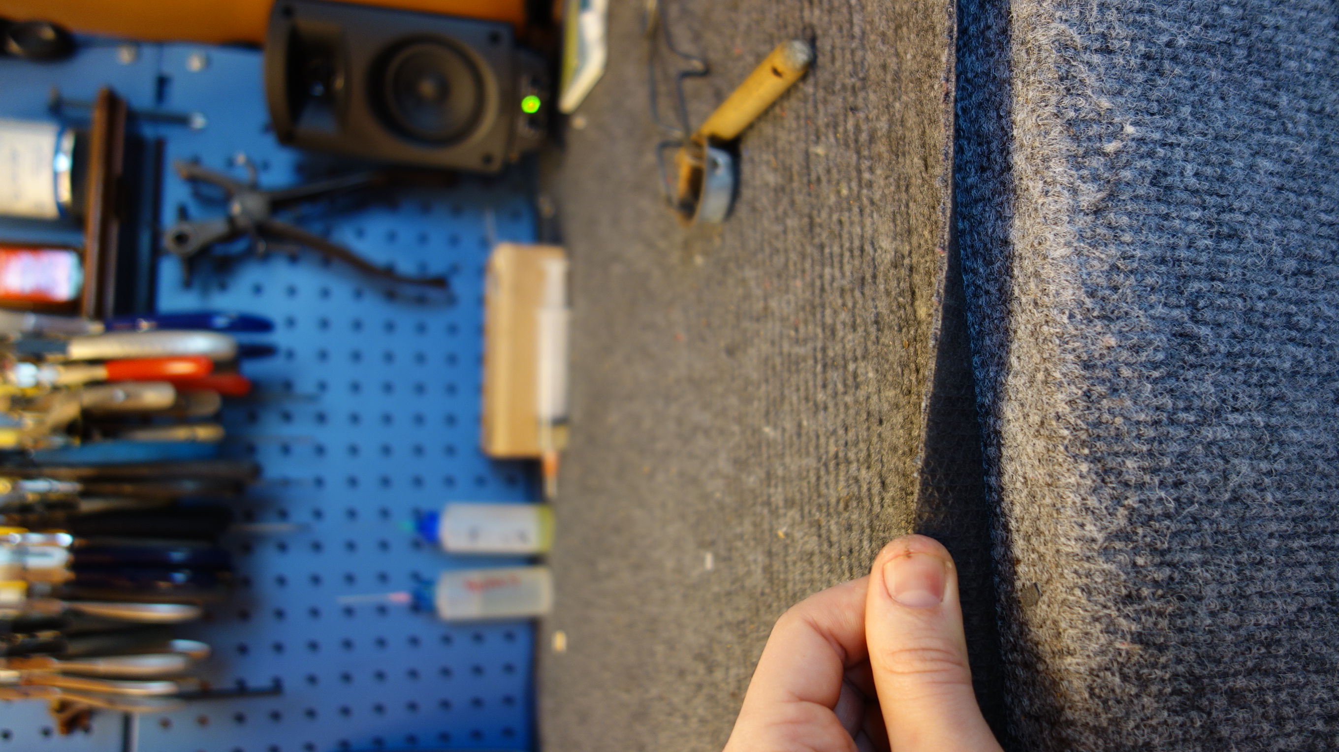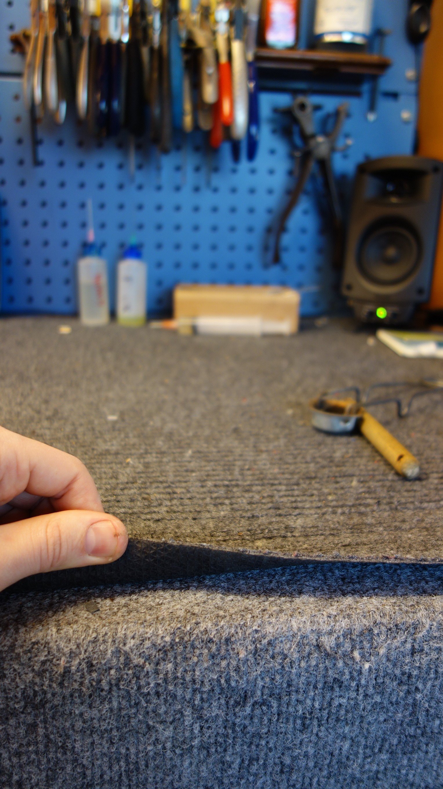 Carpet for bench top Carpet to cover your bench so the instrument you are working on doesn’t get scratched. Rubber backed and tightly woven is what you want- probably indoor/outdoor stuff. I semi-permanently affix one layer to my benchtop using a staple gun and then cut another piece to lay on top that I can shake out and replace in case anything gets spilled or it gets burned. Available at your local carpet store or hardware store. Just make sure its soft enough to feel ok on your skin- your elbows will be resting on it.